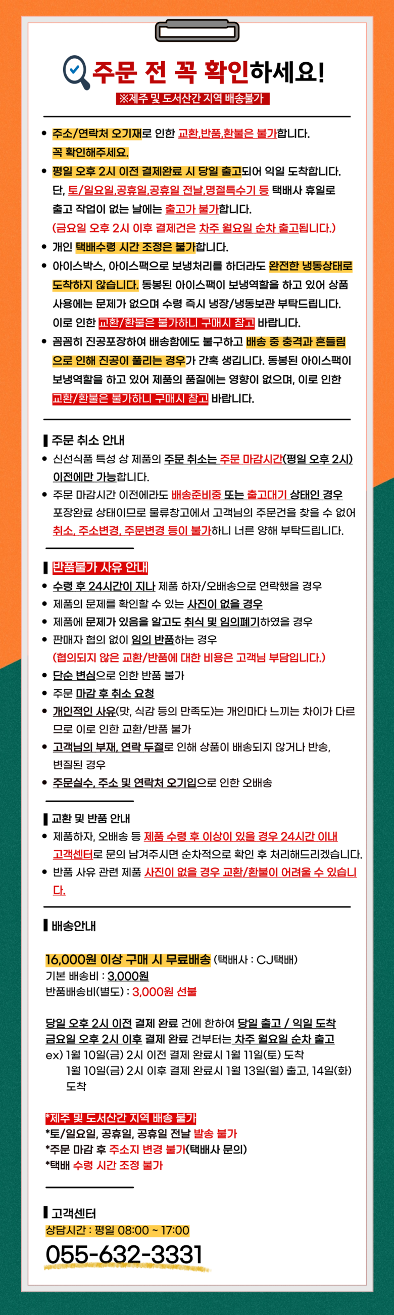 | 배송방법 | 신선/냉장/냉동 | 배송비 | 3,000원 - 16,000원 이상 구매 시 무료배송 - 도서산간 지역 배송불가 |