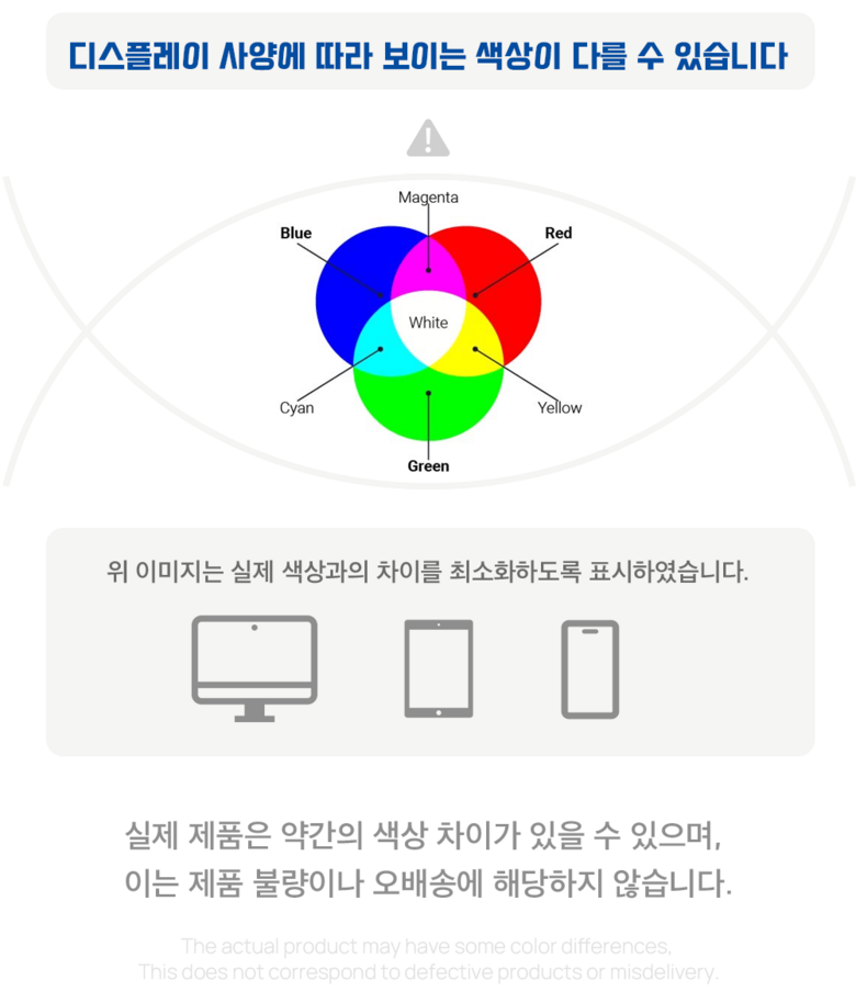 - ㆍ모니터 해상도의 차이로 인해 색상이나 이미지가 실제와 달라, 고객이 단순 변심으로 교환/반품을 무료로 요청하는 경우