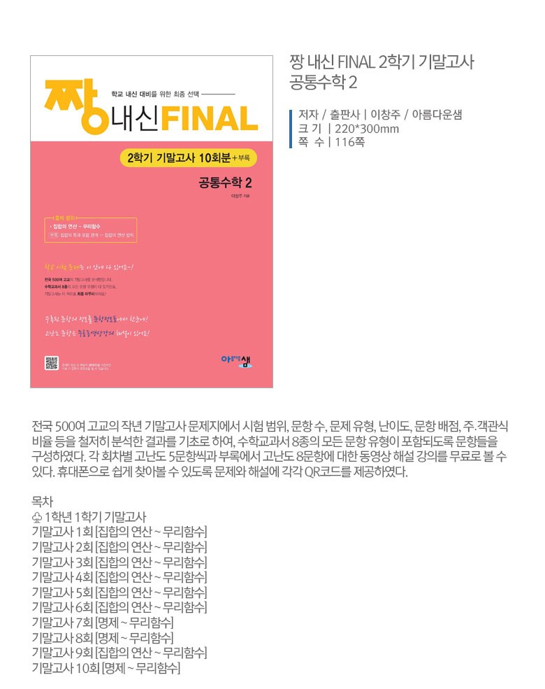 | 도서명 | [아름다운샘] 짱 내신 FINAL 2학기 기말고사 공통수학 2 (2025년) | 저자, 출판사 | 이창주, 아름다운샘 |