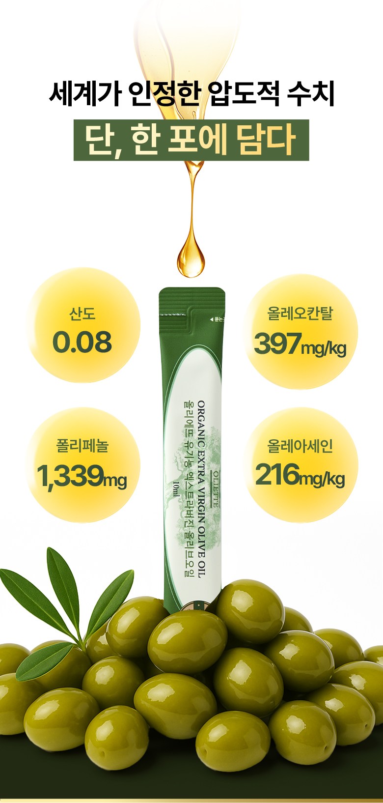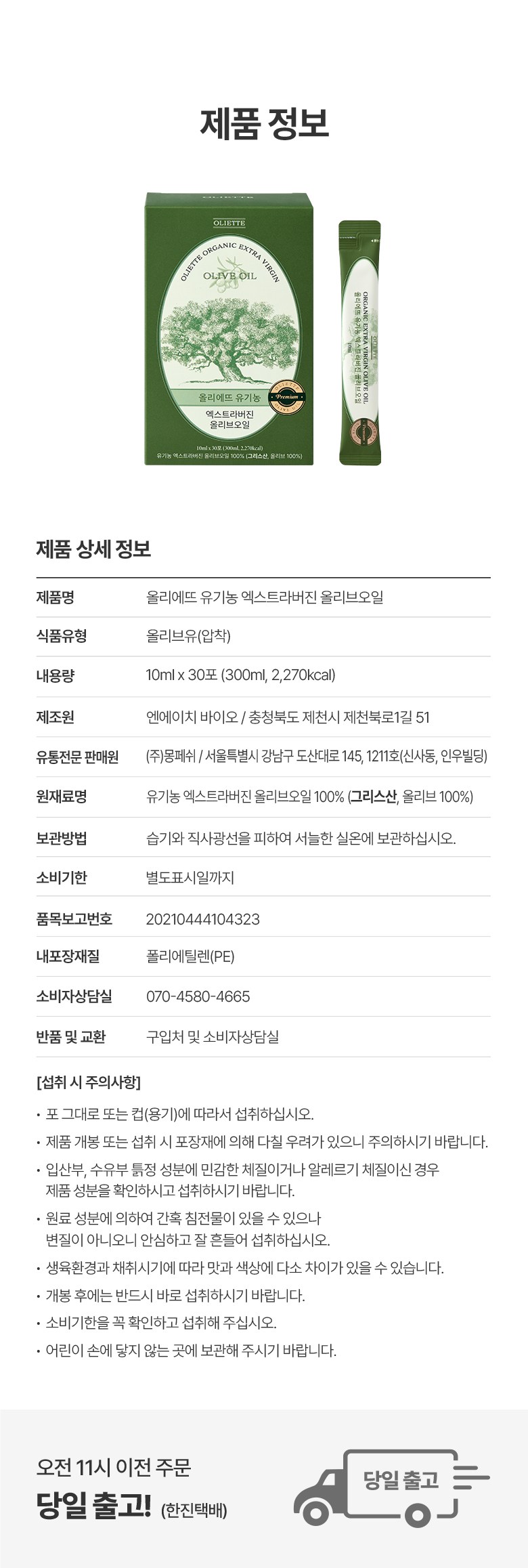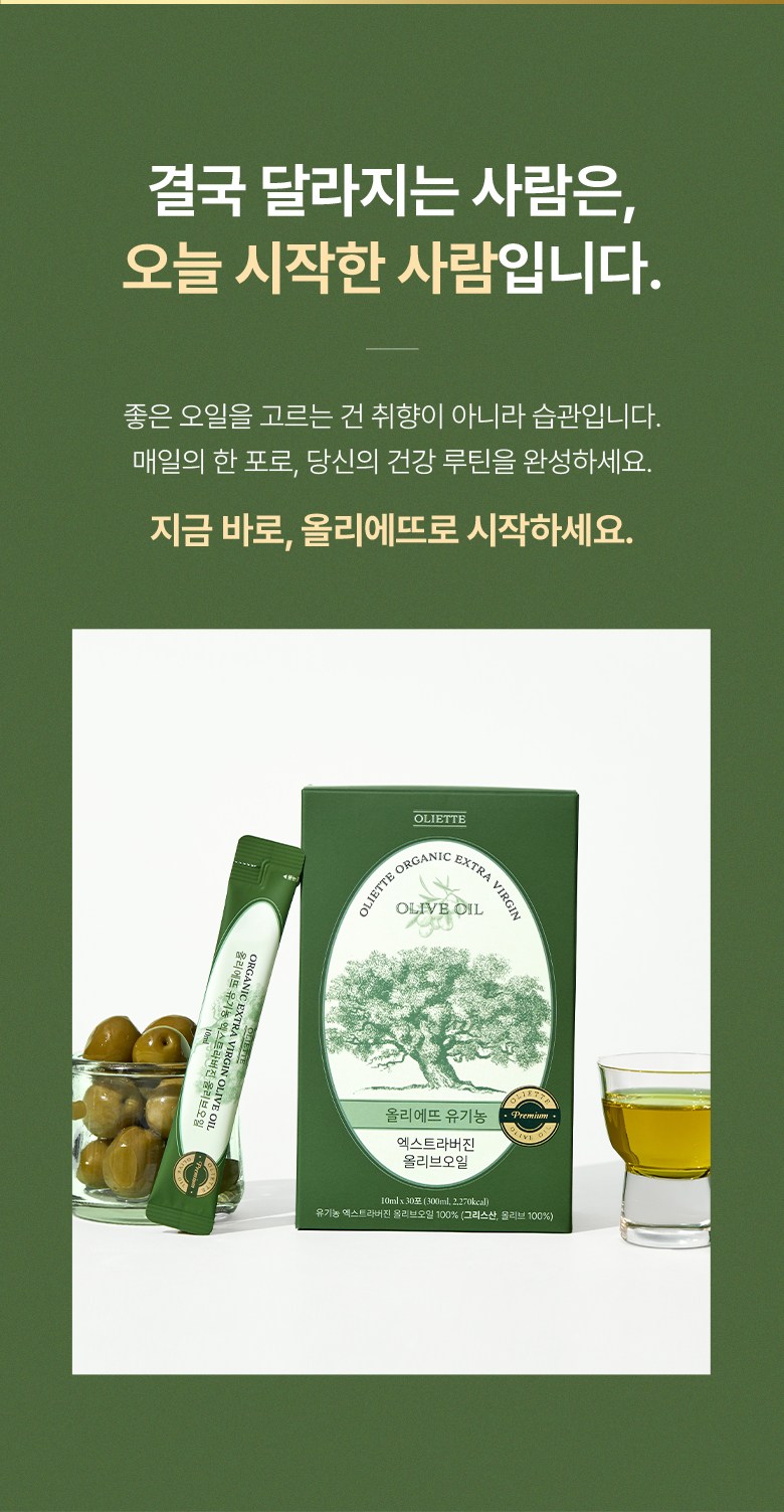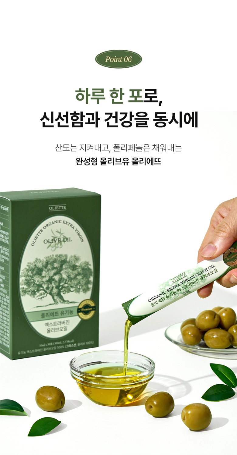 | 포장단위별 내용물의 용량(중량), 수량 | 10ml x 30포 | 원재료명 및 함량 | 유기농 엑스트라버진 올리브오일 100% (그리스산, 올리브 100%) |
