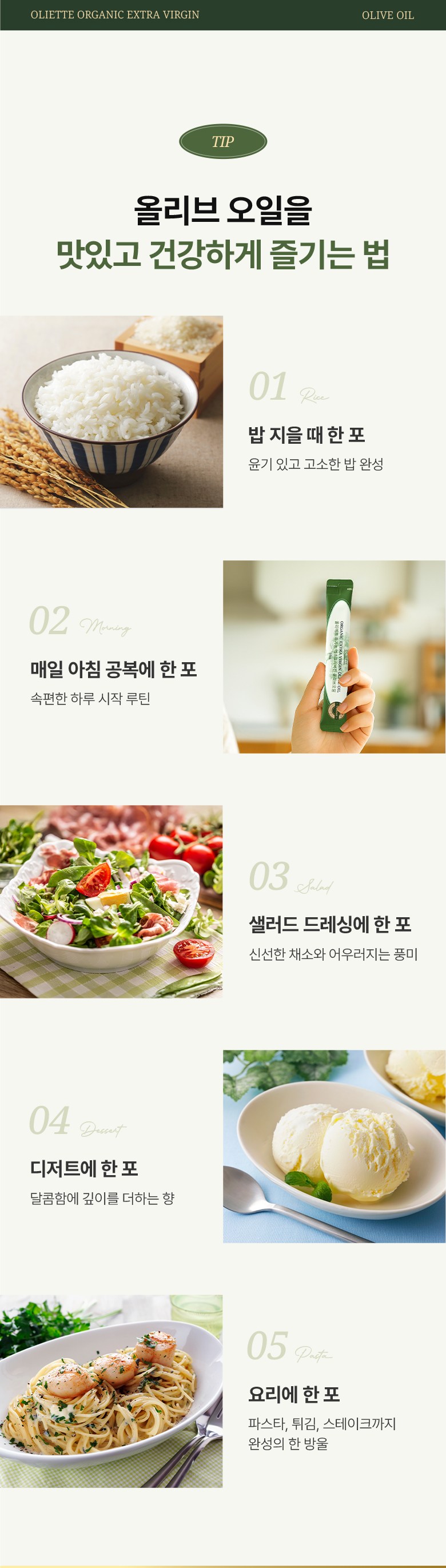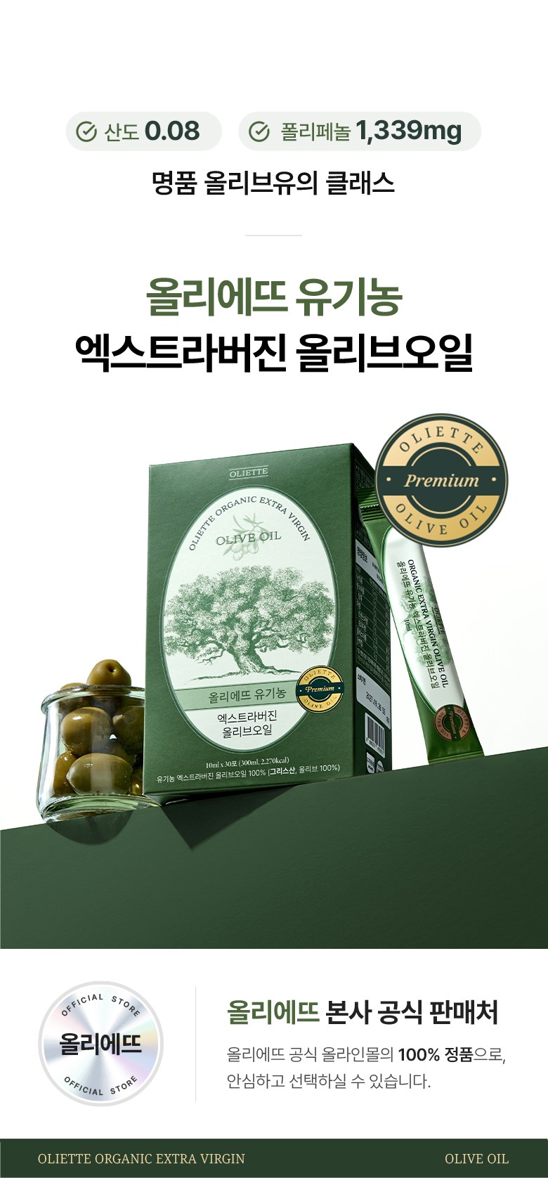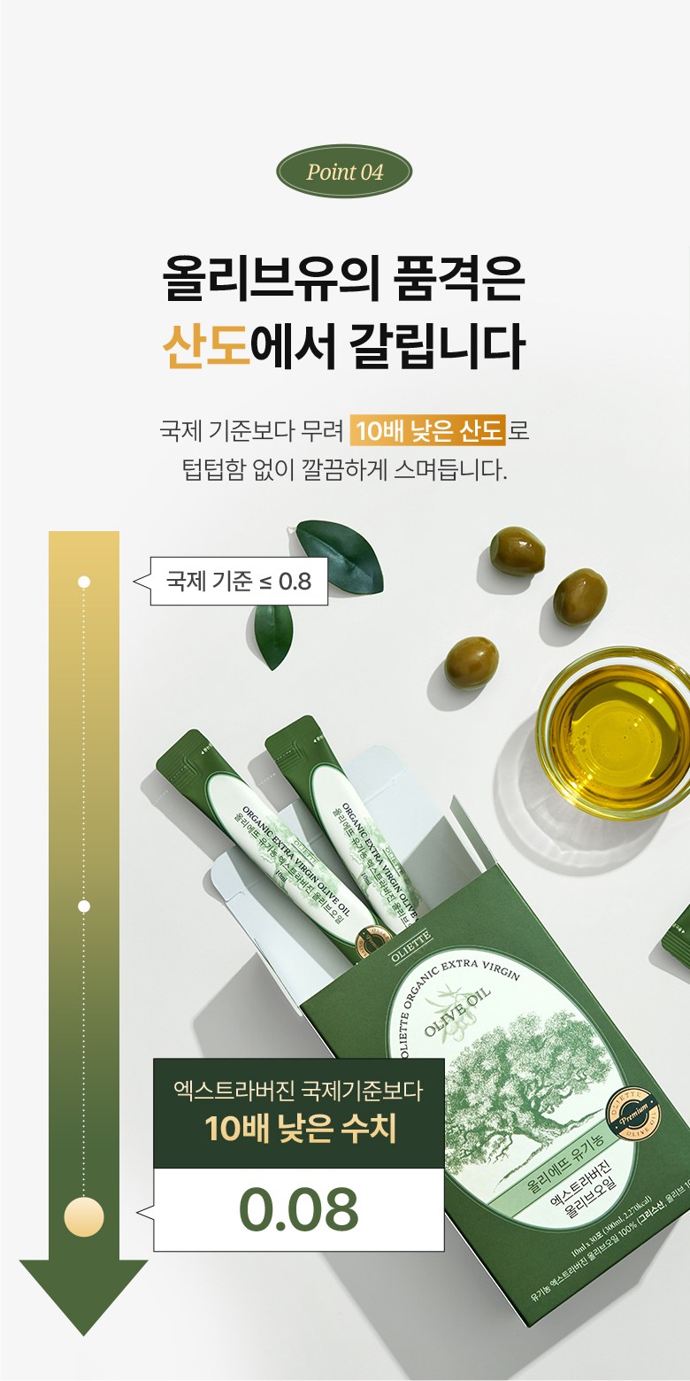 | 포장단위별 내용물의 용량(중량), 수량 | 10ml x 30포 | 원재료명 및 함량 | 유기농 엑스트라버진 올리브오일 100% (그리스산, 올리브 100%) |