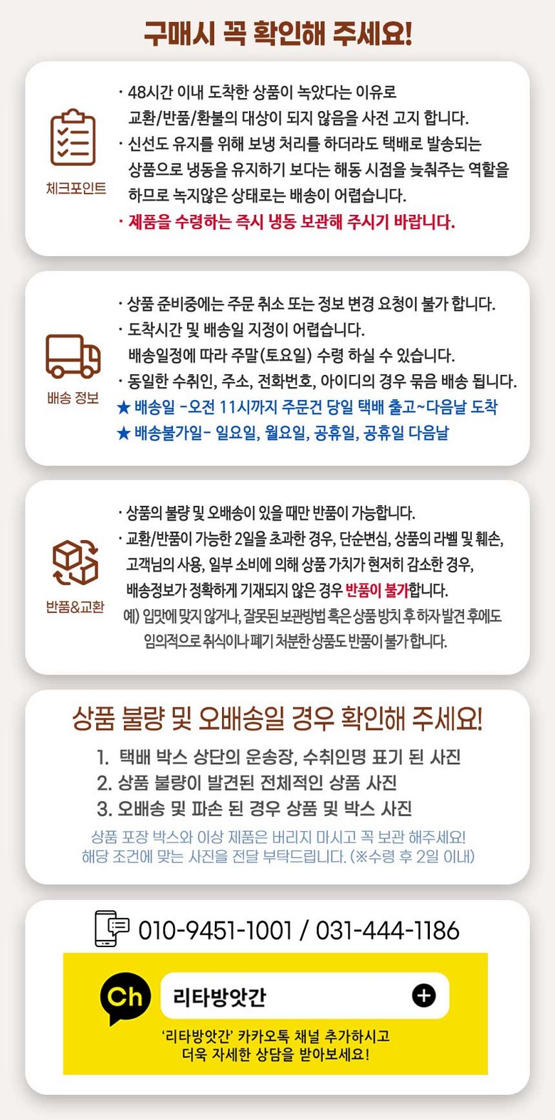 | 배송방법 | 신선/냉장/냉동 | 배송비 | 무료배송 - 도서산간 지역 배송불가 |