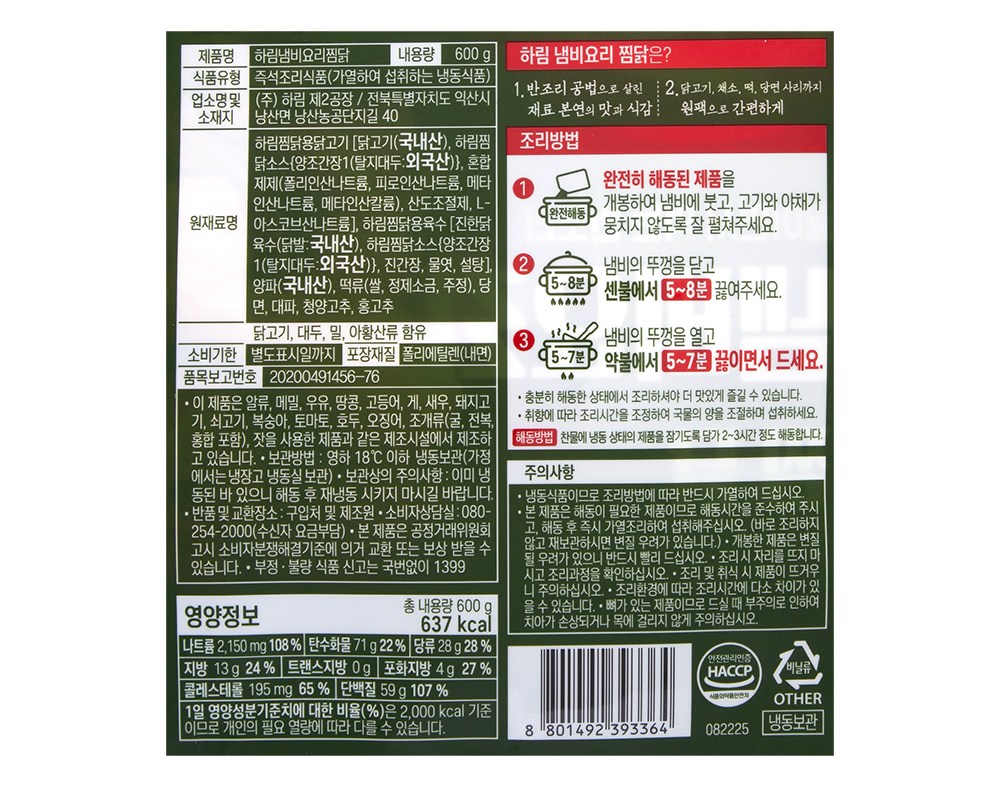 뜨끈한 탕이나 찜 요리는 그릇에 담아 깔끔하게 먹어도 좋지만, 불에 올린 채 먹으면 풍미가 더욱 살아나죠. 끓이면서 먹는 감성을 살려 하림에서 선보이는 찜닭을 만나보세요. 부드러운 닭고기, 쫄깃한 떡과 당면, 아삭한 양파와 대파 등이 어우러져 풍성한 식감을 선사한답니다. 반조리 공법을 활용해 재료 본연의 맛 또한 고스란히 살렸죠. 소스까지 모든 재료가 한 팩에 담겨 있으니, 해동 후 냄비에 부어 끓이기만 하면 뜨끈한 찜닭이 뚝딱 완성될 거예요.