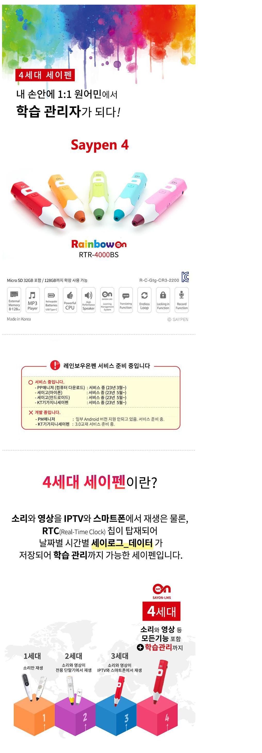 | 품명 및 모델명 | 레인보우펜, RTR-4000BS | KC 인증정보 | 본품 : CB061A466-3002, R-C-Gtg-CR3-2200, 전지 : XU100743-16001H |