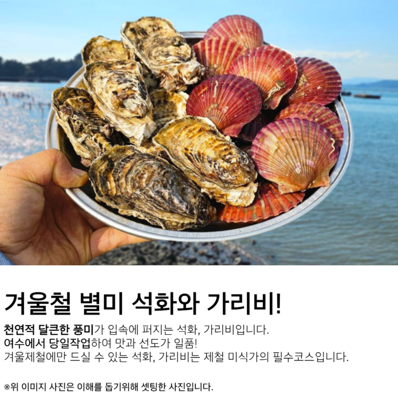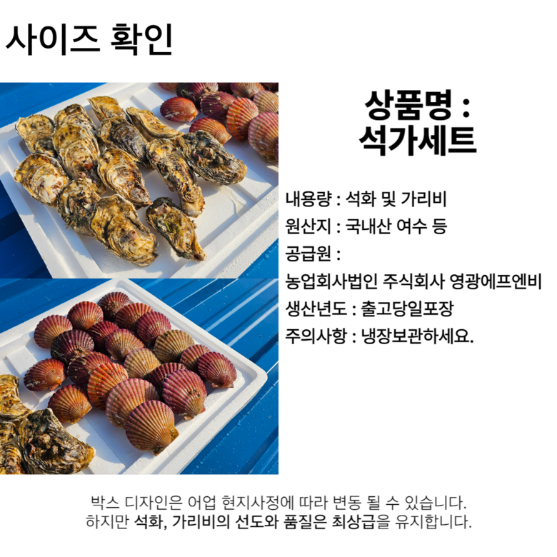 | 품목 또는 명칭 | 프리미엄 석화 가리비 세트 | 포장단위별 내용물의 용량(중량),수량,크기 | 3kg~10kg |