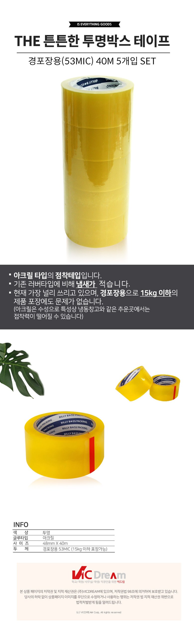 | 품명 및 모델명 | THE 튼튼한 투명 박스테이프 경포장용(53MIC) 40M SET | 인증/허가 사항 | 해당없음 |