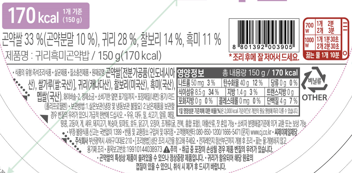 | 제품명 | 귀리흑미곤약밥 | 식품의 유형 | 컨텐츠 참조 |