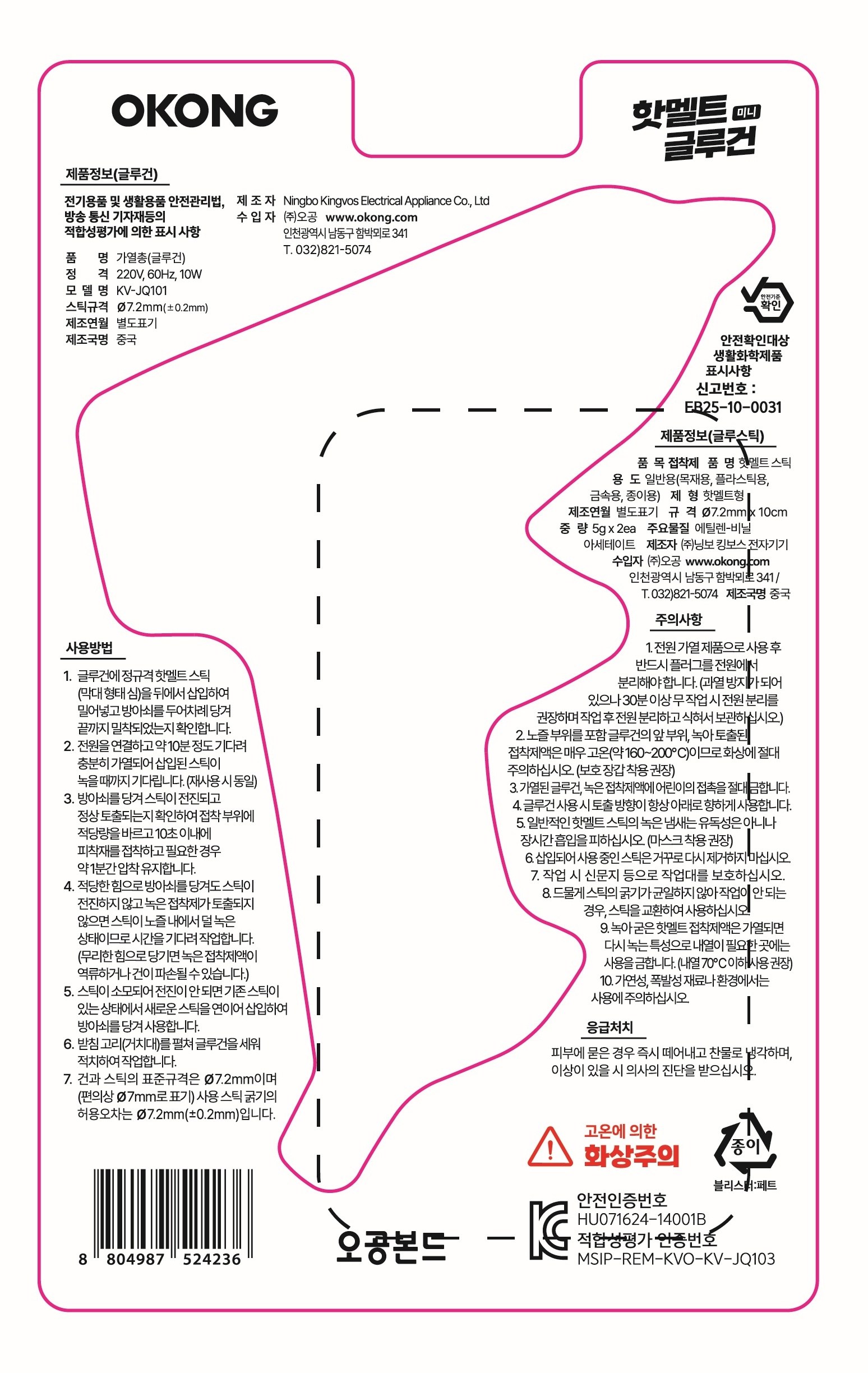| 품명 및 모델명 | 가열총(글루건) / KV-JQ101 | KC 인증정보 | 글루건: HU071624-14001B, MSIP-REM-KVO-KV-JQ103 | 글루스틱: EB25-10-0031 |