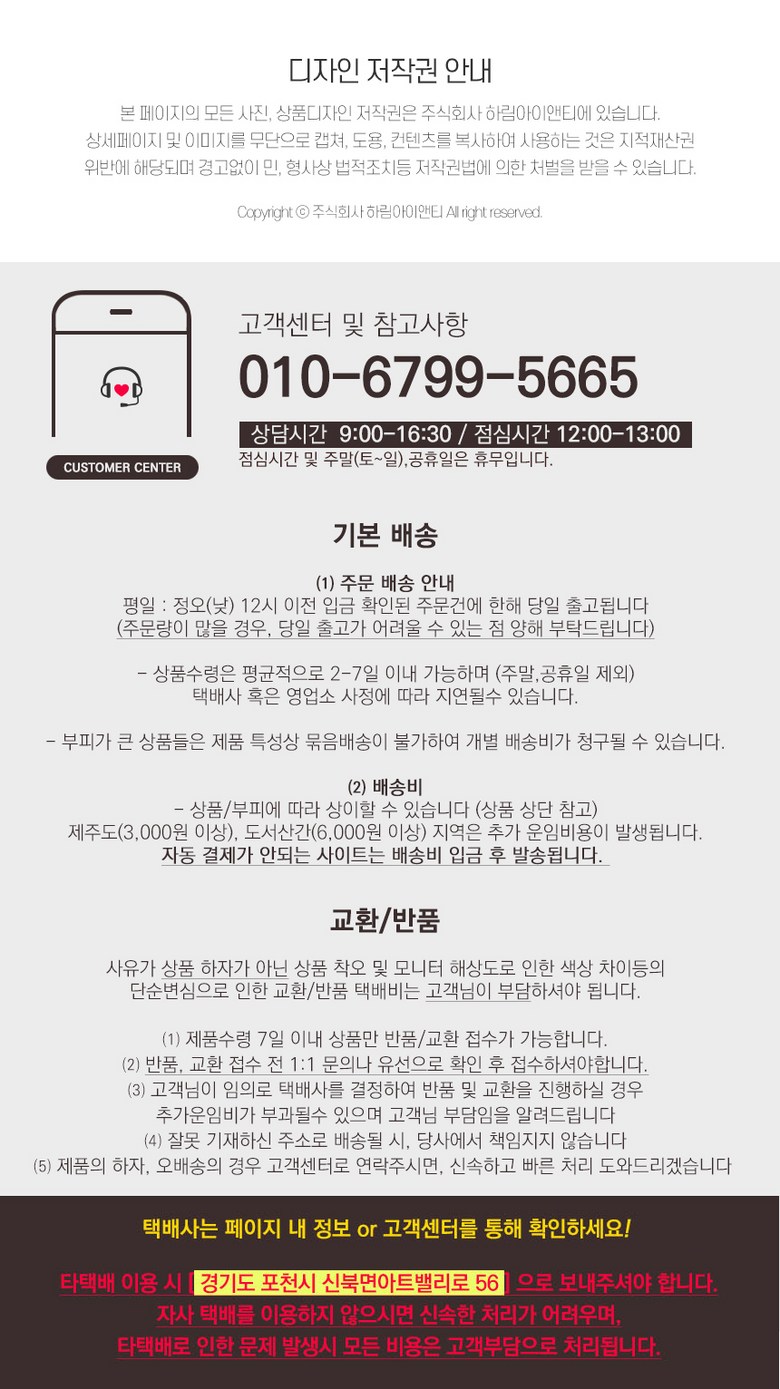 - ㆍ모니터 해상도의 차이로 인해 색상이나 이미지가 실제와 달라, 고객이 단순 변심으로 교환/반품을 무료로 요청하는 경우