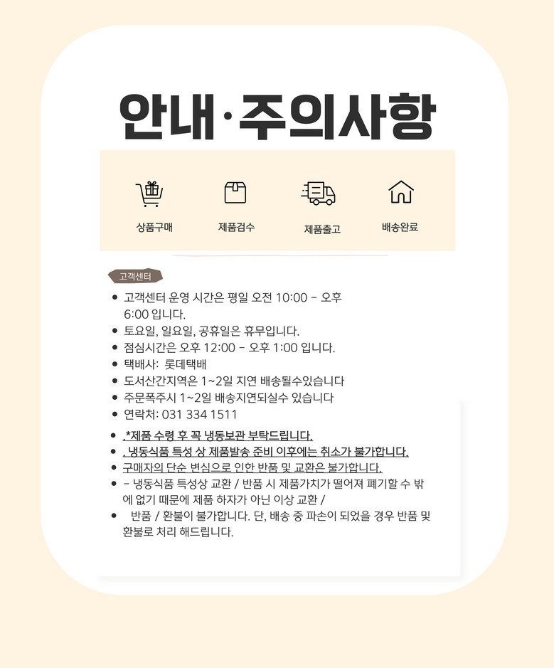 - 상품문의 및 후기게시판을 통해 취소나 환불, 반품 등은 처리되지 않습니다.