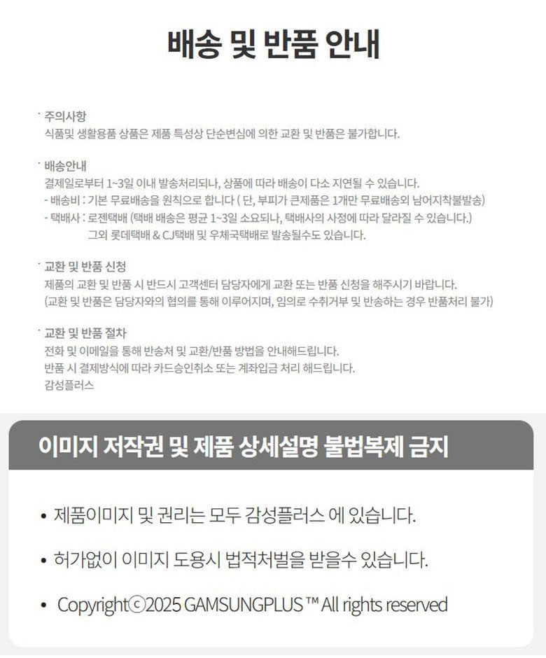 - ㆍ교환/반품에 관한 일반적인 사항은 판매자가 제시사항보다 관계법령이 우선합니다.