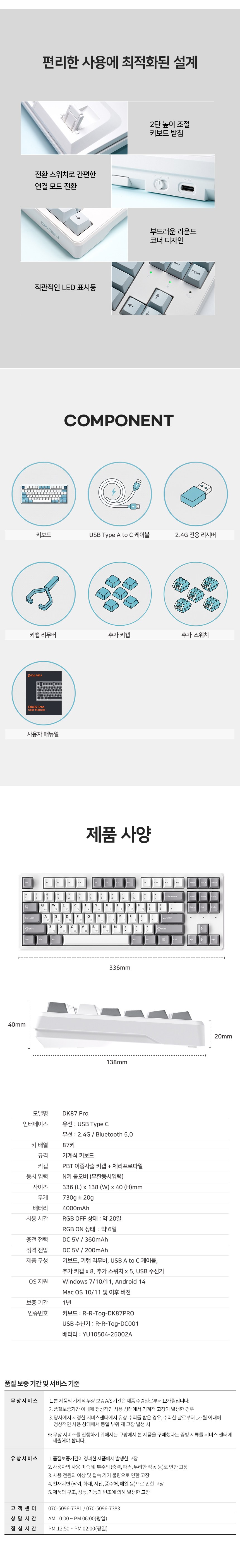 | 품명 및 모델명 | 블루투스 기계식 키보드 / DK87 Pro | KC 인증정보 | 키보드 : R-R-Tog-DK87PRO / 수신기 : R-R-Tog-DC001 / 전지 : YU10504-25002 |