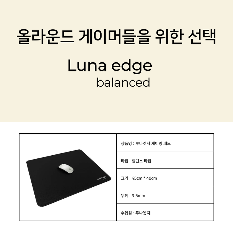 | 품명 및 모델명 | 루나엣지 게이밍 마우스패드 밸런스타입 | 인증/허가 사항 | 법에 의한 인증·허가 등을 받았음을 확인할 수 있는 경우 그에 대한 사항 |