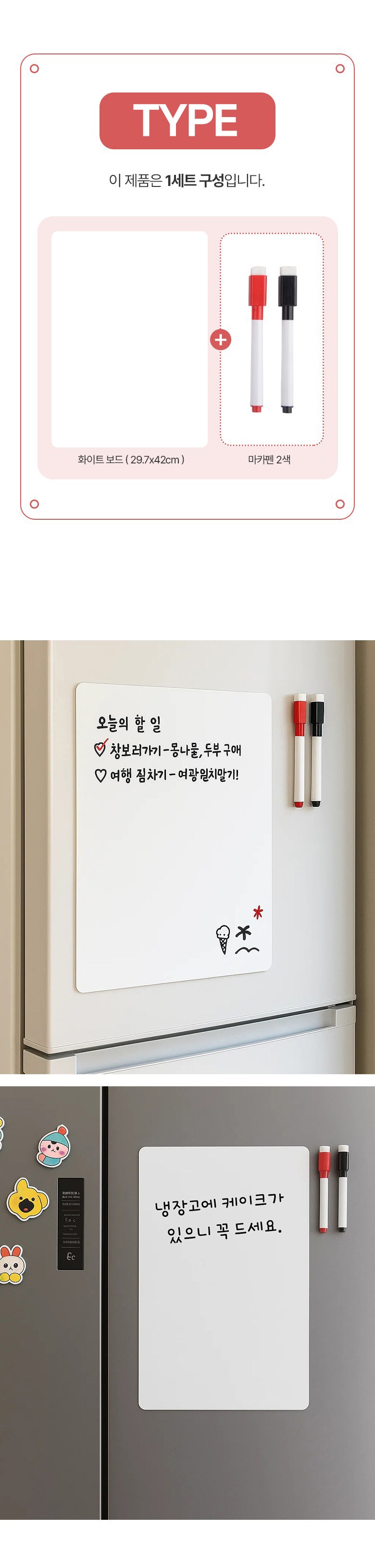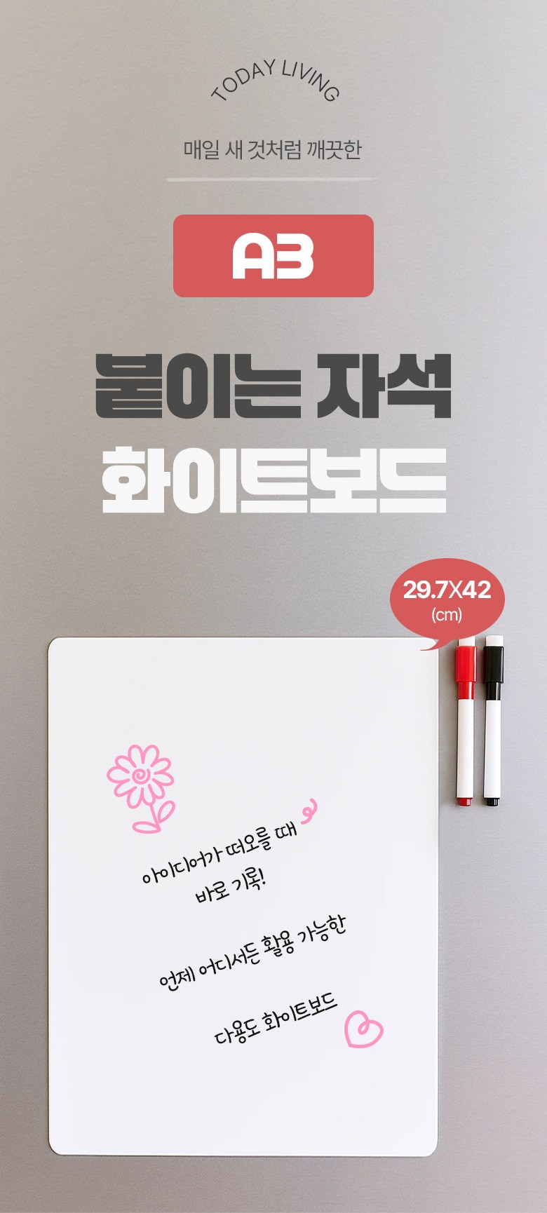 | 품명 및 모델명 | 투데이리빙 A3 붙이는 자석 화이트보드+마카펜 2개 | 인증/허가 사항 | 해당없음 |