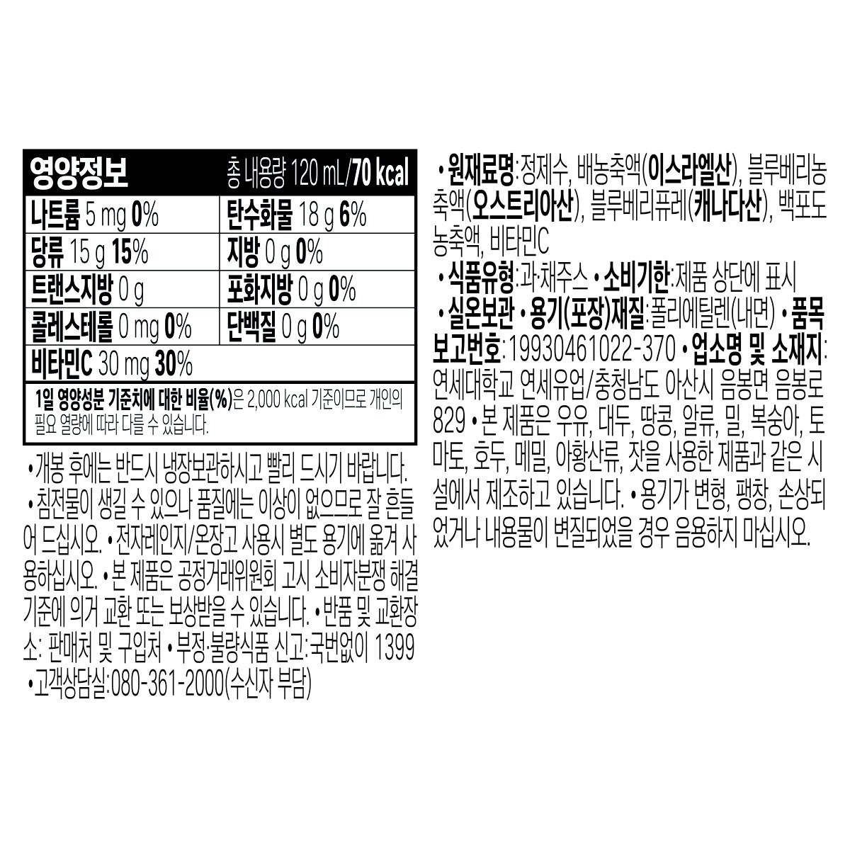 | 제품명 | 연세 고농축 주스 30알의 블루베리 | 식품의 유형 | 컨텐츠 참조 |