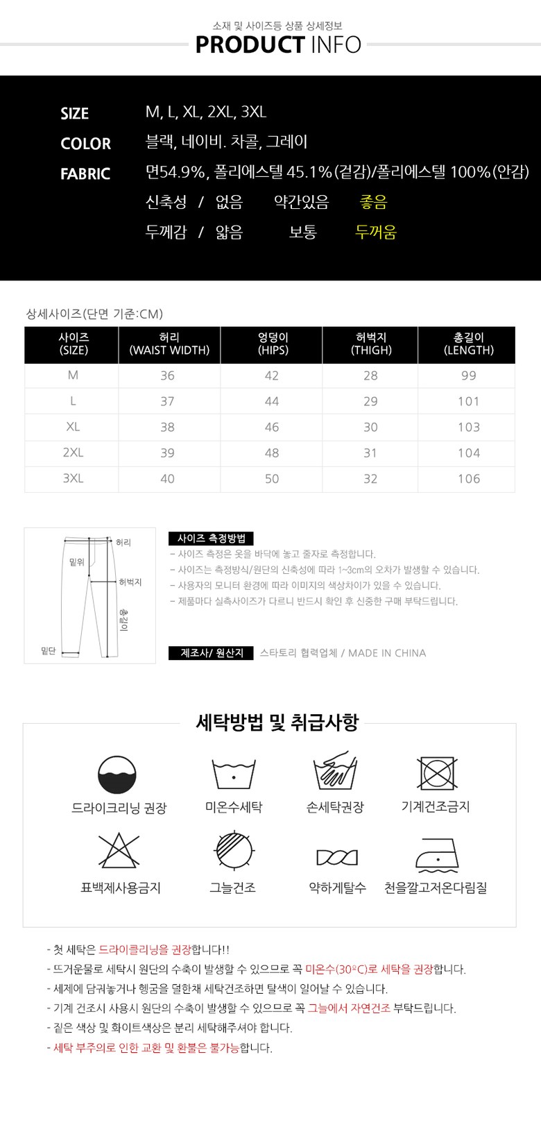 | 제조국 | 대한민국 | 세탁방법 및 취급시 주의사항 | 단독손세탁 또는 드라이크리닝 권장 |
