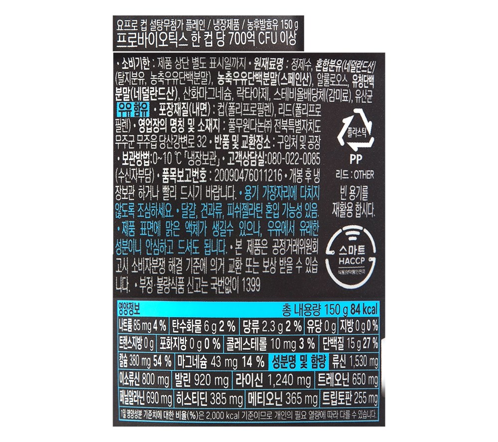 | 제품명 | 요프로 컵 설탕무첨가 플레인 | 식품의 유형 | 농후발효유 |