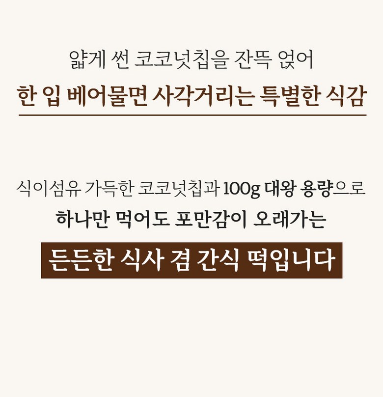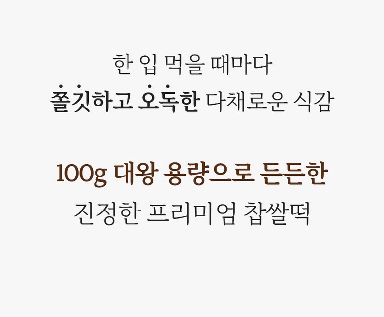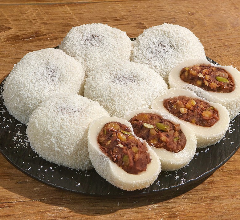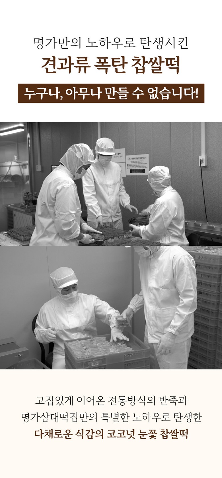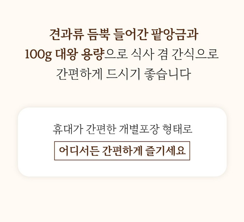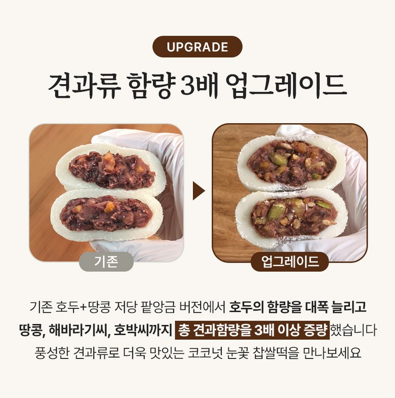 | 포장단위별 내용물의 용량(중량), 수량 | 1kg(100g × 10개) / 2kg(100g × 20개) | 원재료명 및 함량 | 찹쌀(국산) 58.1%, 통팥앙금 21.7% [통팥앙금: 팥 58.3%(팥 99.8%(중국산)), 산도조절제1, 산도조절제2], 설탕, 말티톨시럽(감미료), 물엿, 정제소금(국산), 변성전분, 호두(미국산) 7.8%, 코코넛가루(필리핀산) 4.6%, 볶음콩(중국산) 2.6%, 백설탕 1.6%, 해바라기씨(중국산) 1.3%, 호박씨(중국산) 1.3%, 천일염(국산/신안) 0.8%, 기타가공품 0.2% |