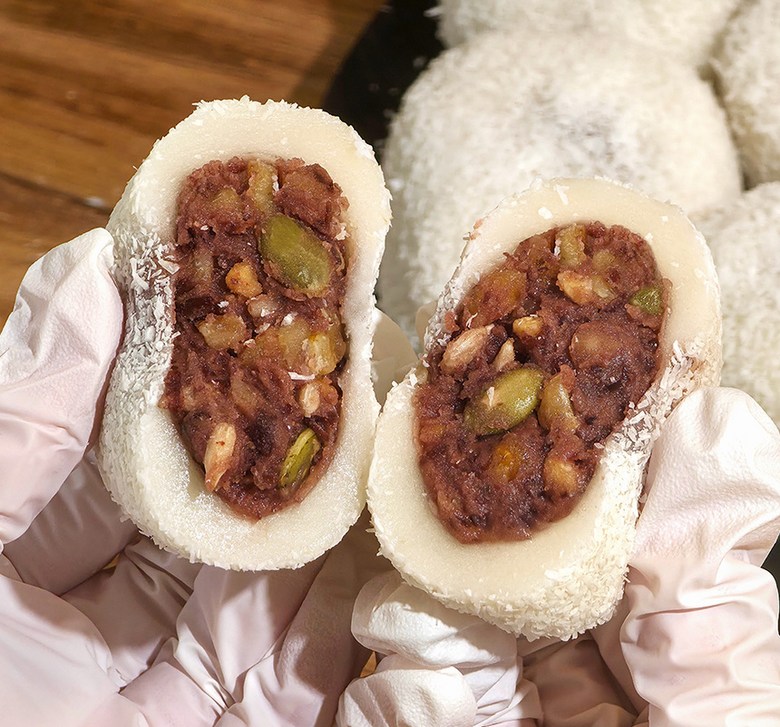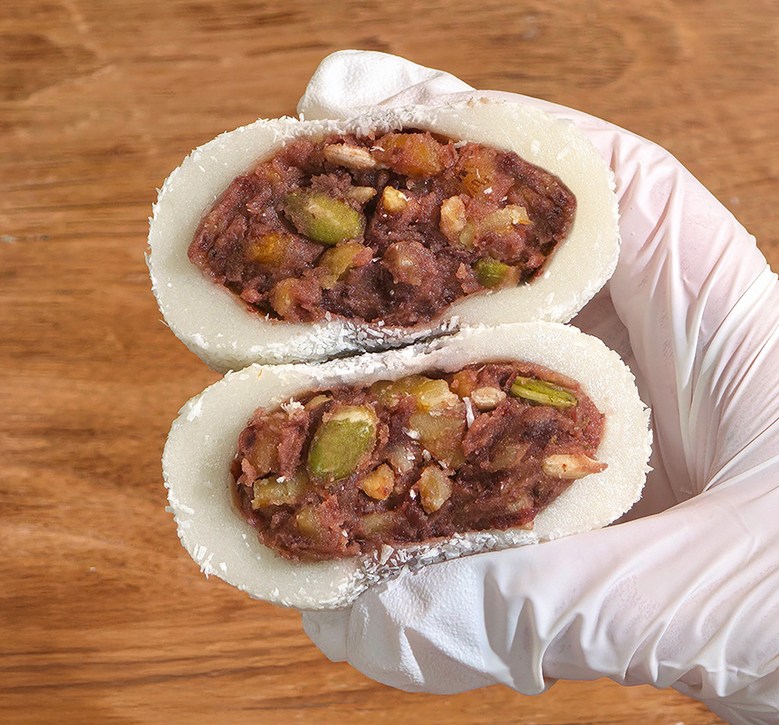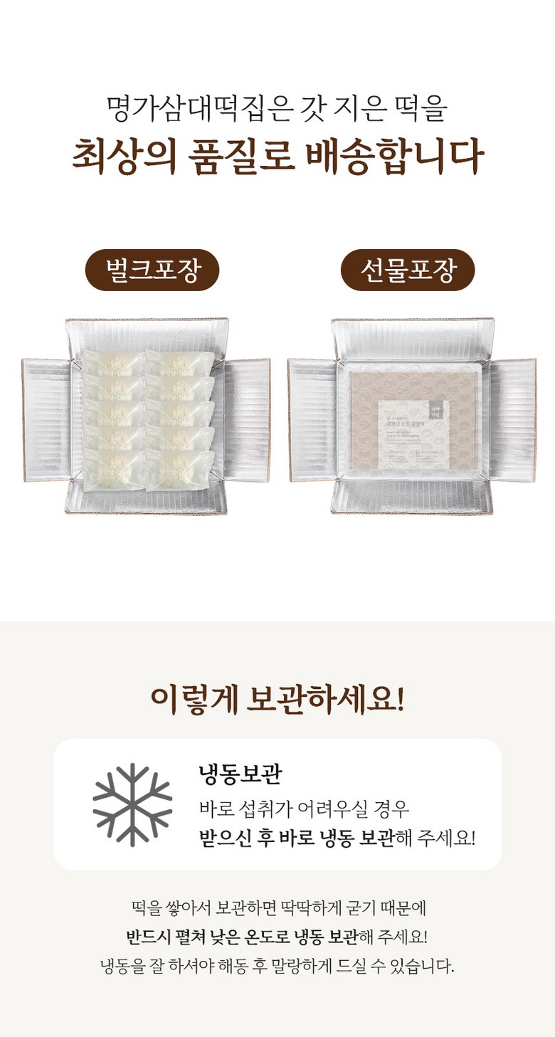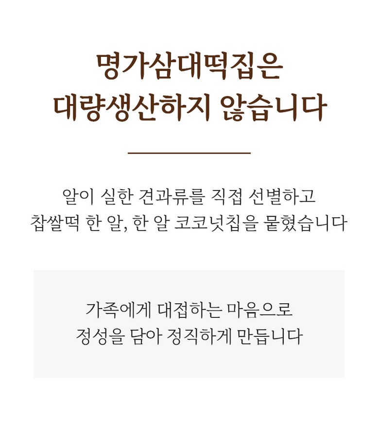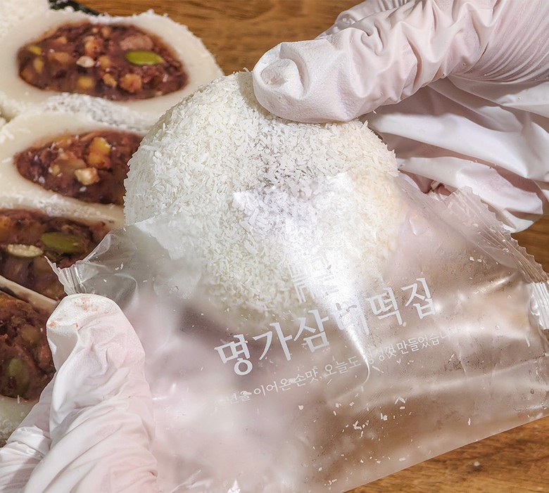 | 포장단위별 내용물의 용량(중량), 수량 | 1kg(100g × 10개) / 2kg(100g × 20개) | 원재료명 및 함량 | 찹쌀(국산) 58.1%, 통팥앙금 21.7% [통팥앙금: 팥 58.3%(팥 99.8%(중국산)), 산도조절제1, 산도조절제2], 설탕, 말티톨시럽(감미료), 물엿, 정제소금(국산), 변성전분, 호두(미국산) 7.8%, 코코넛가루(필리핀산) 4.6%, 볶음콩(중국산) 2.6%, 백설탕 1.6%, 해바라기씨(중국산) 1.3%, 호박씨(중국산) 1.3%, 천일염(국산/신안) 0.8%, 기타가공품 0.2% |
