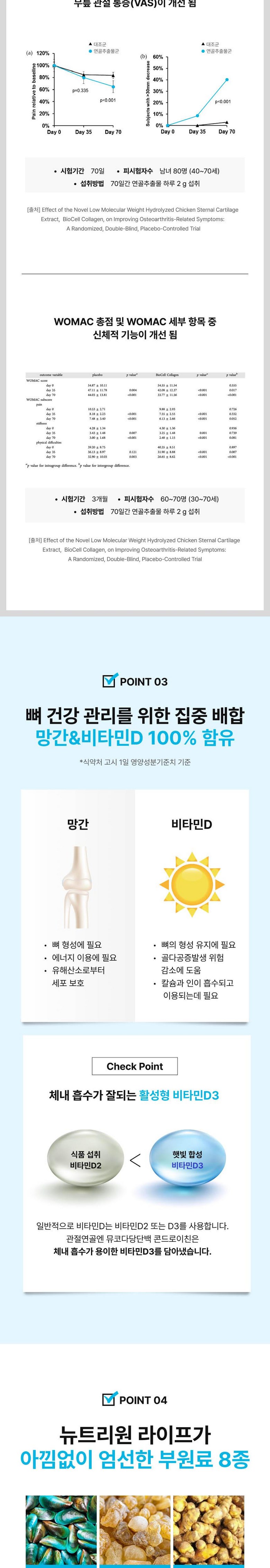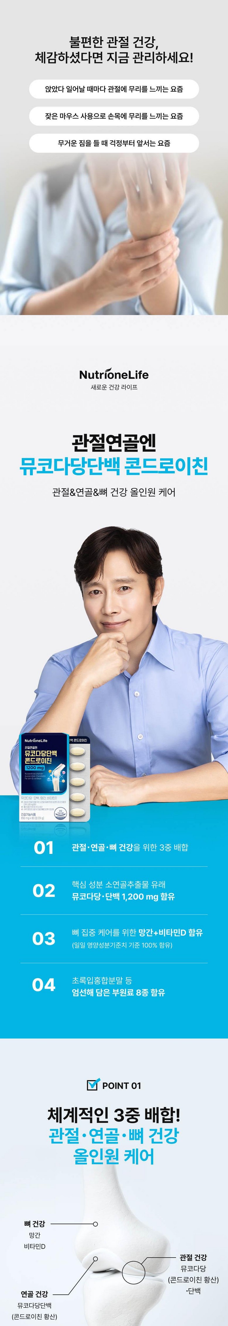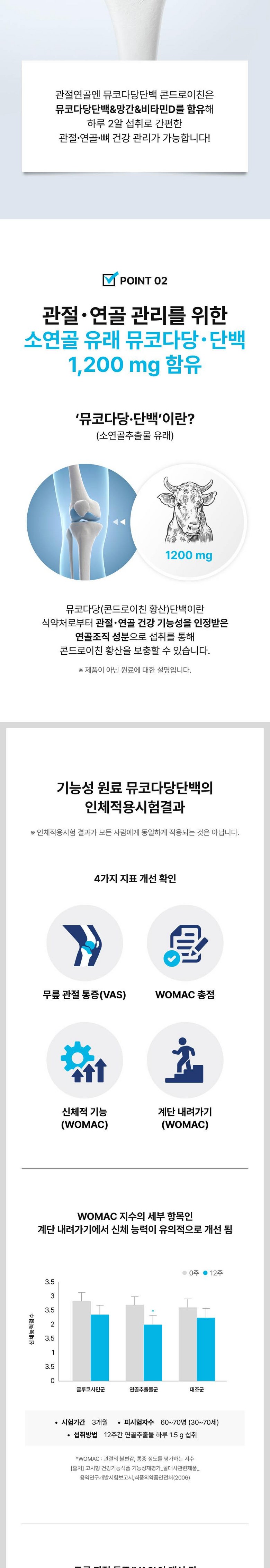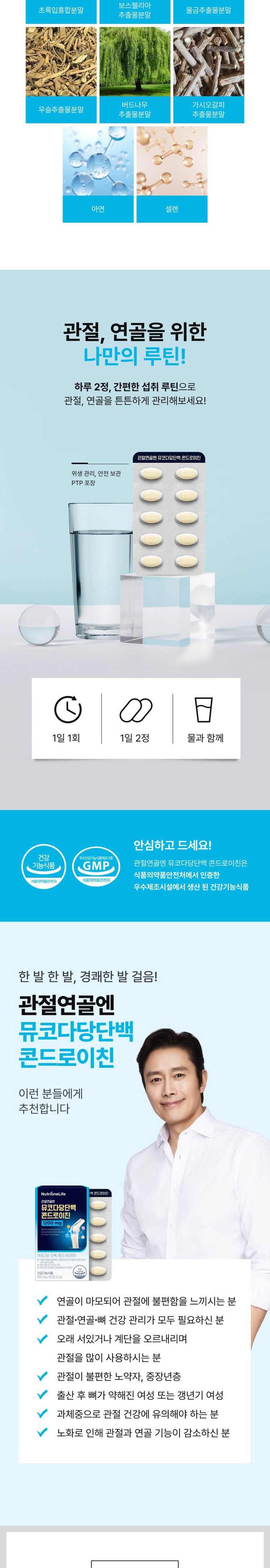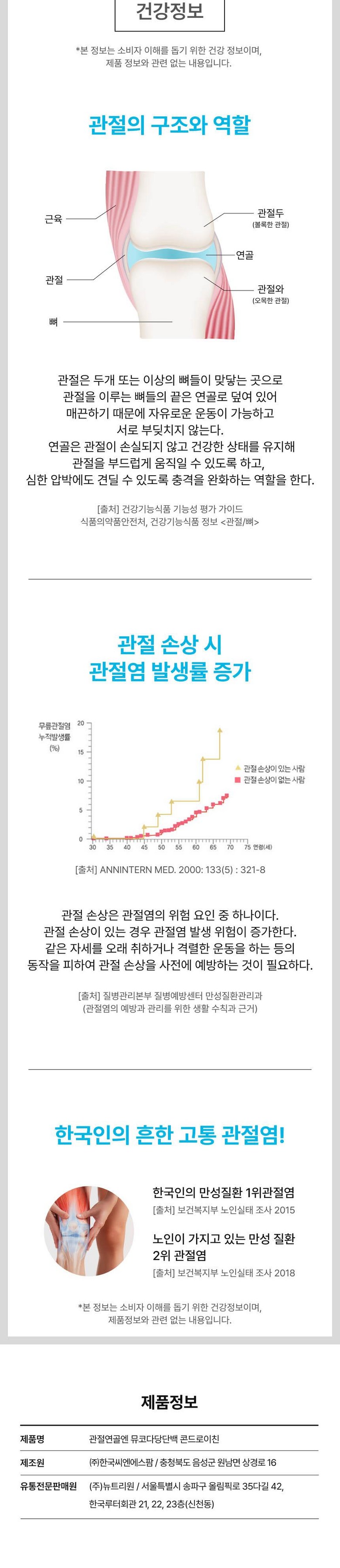 | 원료명 및 함량 | 소연골분말(중국산), 황산망간, 분말비타민D3{비타민D3, 아라비아검, 자당, 옥수수전분, 가공유지(팜유), 이산화규소, dl-a-토코페롤}, 해조칼슘(영국산), 히드록시프로필메틸셀룰로스, 이산화규소, 스테아린산마그네슘, 초록입홍합분말(뉴질랜드산), 보스웰리아추출물분말(인도산), 강황추출물분말{강황추출물분말(강황 : 인도산)}, 우슬추출분말{우슬추출고형분(우슬 : 중국산)}, 버드나무가지껍질추출분말(미국산), 가시오갈피추출물분말{가시오갈피추출고형분(가시오갈피 : 국산)}, 산화아연, 건조효모(셀렌/미국산) 홍합, 쇠고기 함유 | 영양정보 | 1일 섭취량 : 2정(1,700mg)/열량 5kcal, 탄수화물 0g(0%), 단백질 1g(2%), 지방 0g(0%), 나트륨 25mg(1%) |