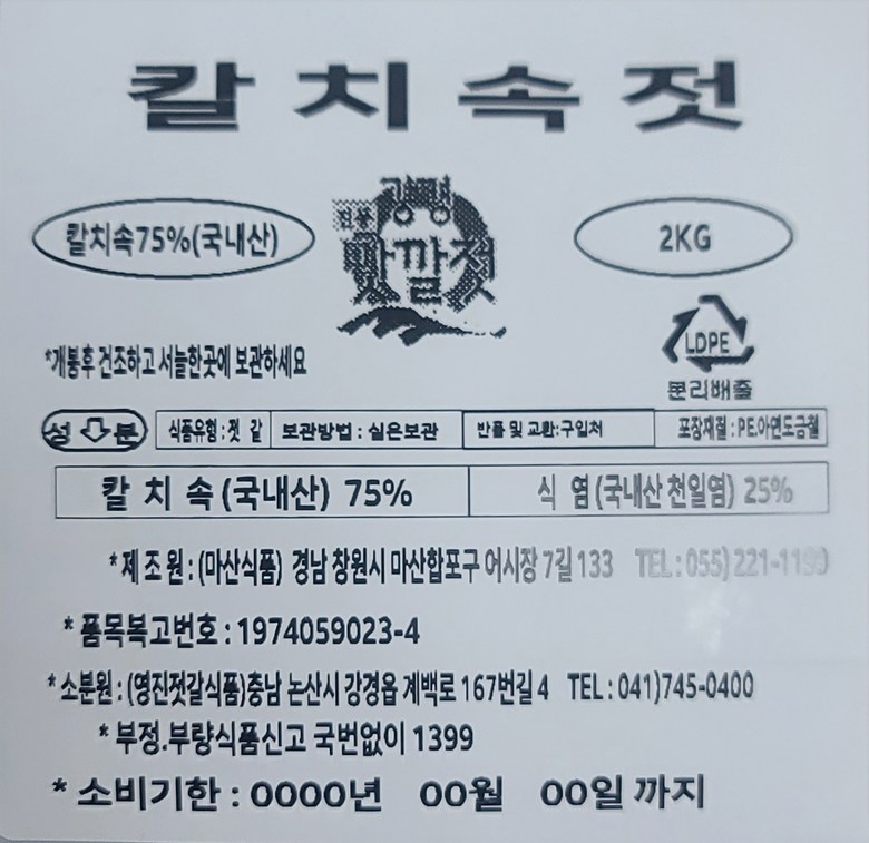| 생산자(수입자) | 영진젓갈식품 | 원산지 | 국내산 |