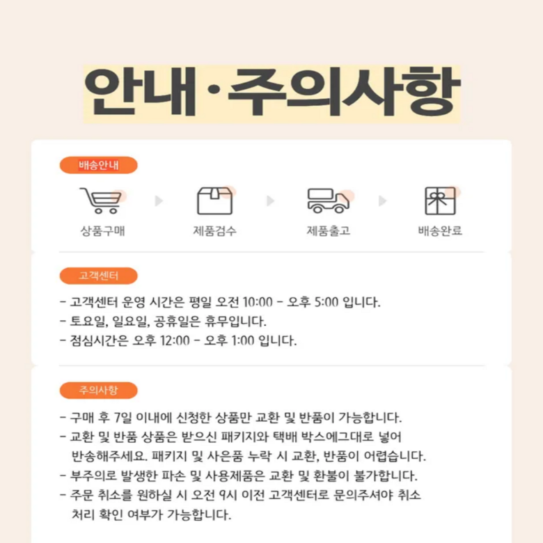 - 상품문의 및 후기게시판을 통해 취소나 환불, 반품 등은 처리되지 않습니다.