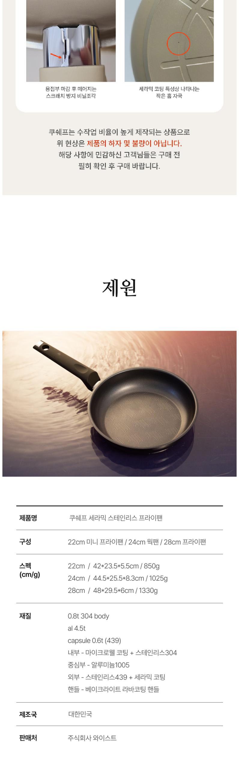 | 품명 및 모델명 | 쿠쉐프 세라믹 스테인리스 프라이팬 | 재질 | 컨텐츠 참조 |