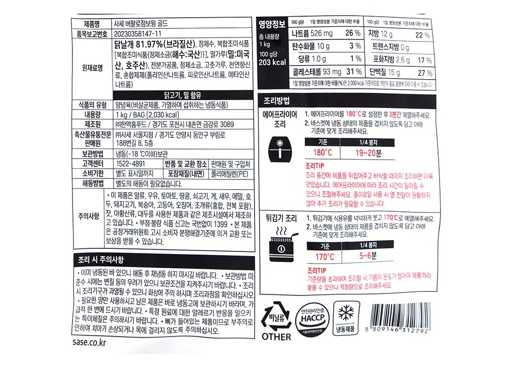 매콤한 맛이 매력적인 사세 버팔로 점보윙 골드를 소개합니다. 큰 크기의 날개 부위만을 모아 만들었어요. 낮은 온도에서 숙성하고, 스팀 오븐 공법으로 구워 내 촉촉한 육즙과 야들야들한 식감이 살아 있는데요. 여기에 매콤 시즈닝을 발라 직화 풍미를 더했죠. 에어프라이어로 간편하게 조리해, 간편한 간식이나 술안주로 즐겨 보세요.