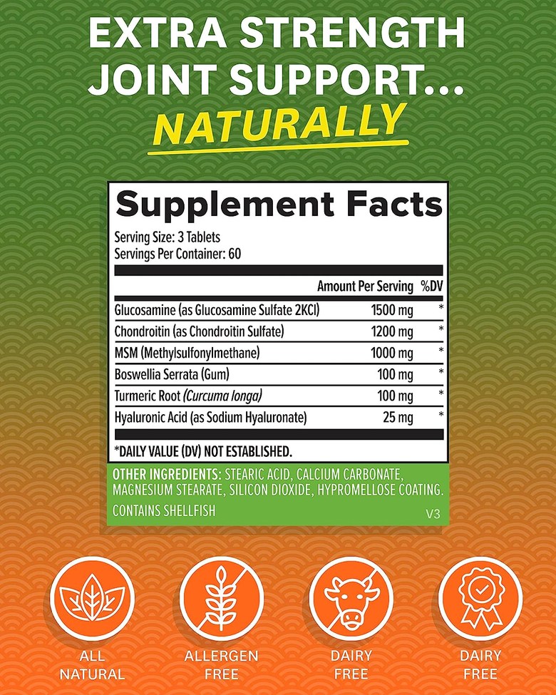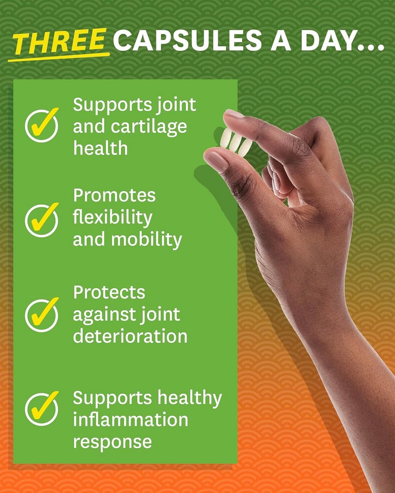1인분 당 글루코사민 황산염 KCI, 콘드로이틴 황산염, MSM, 보스웰리아, 커큐민, 히알루론산을 제공합니다. 타블렛 제형입니다.