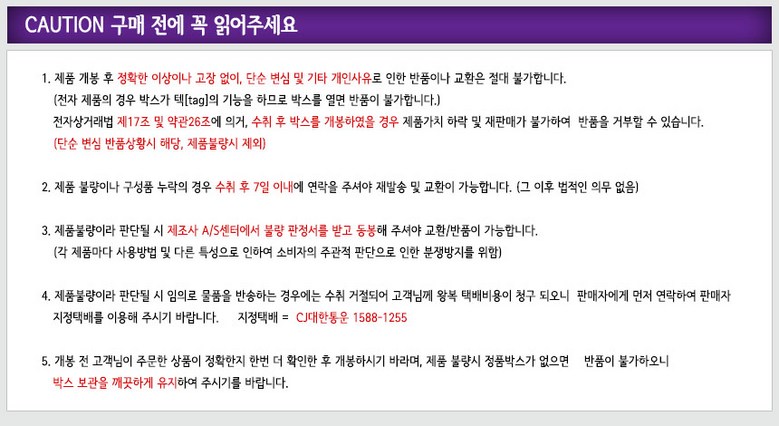 - ㆍ교환/반품에 관한 일반적인 사항은 판매자가 제시사항보다 관계법령이 우선합니다.