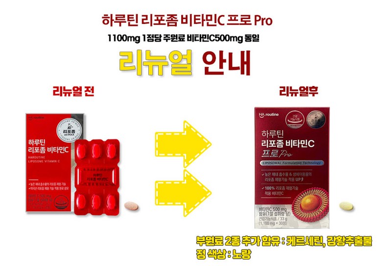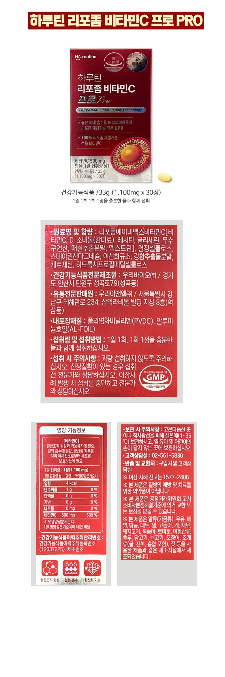 | 소비기한 및 보관방법 | 소비기한 : 제조일로부터 24개월 / 2027년 10월 | 포장단위별 내용물의 용량(중량), 수량 | 하루틴 리포좀비타민C프로 [ (1,100mg x 30정) 1박스 |
