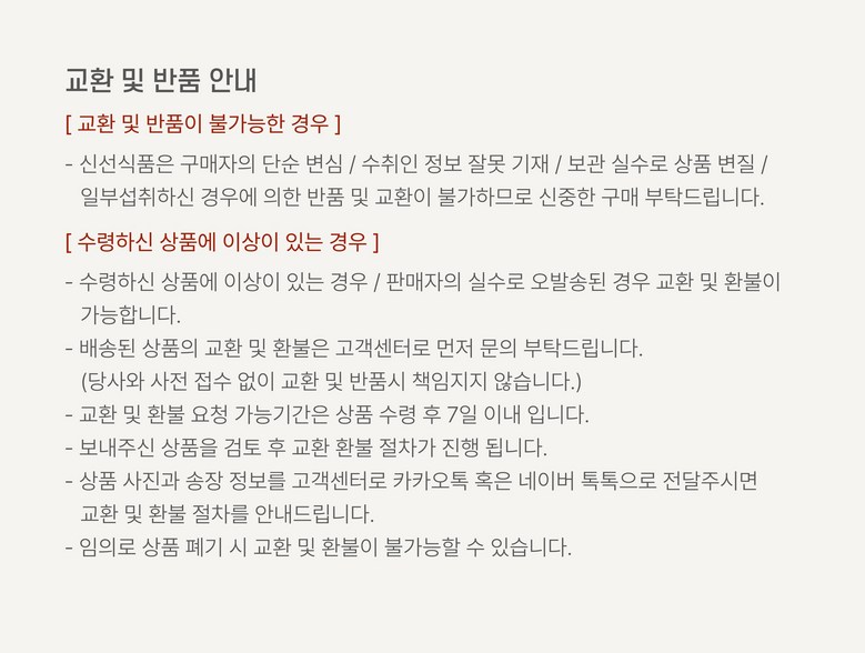 - ㆍ교환/반품에 관한 일반적인 사항은 판매자가 제시사항보다 관계법령이 우선합니다.