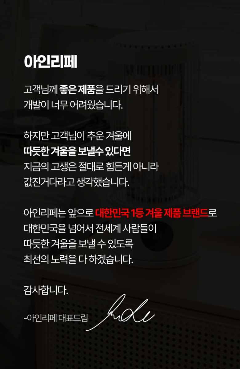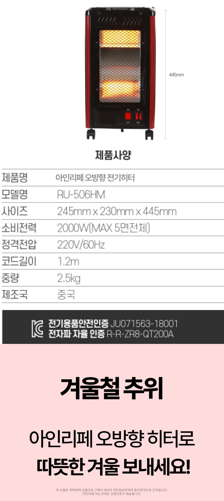 | 품명 및 모델명 | 아인리페 오방난로 | KC 인증정보 | 상품 상세페이지 참조 |