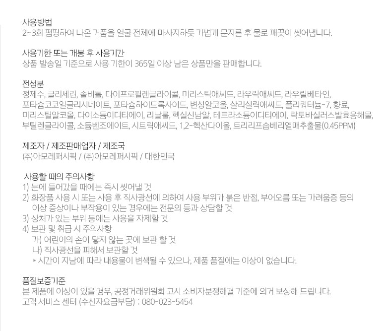 | 화장품제조업자, 화장품책임판매업자 및 맞춤형화장품판매업자 | 컨텐츠 참조 | 제조국 | 컨텐츠 참조 |