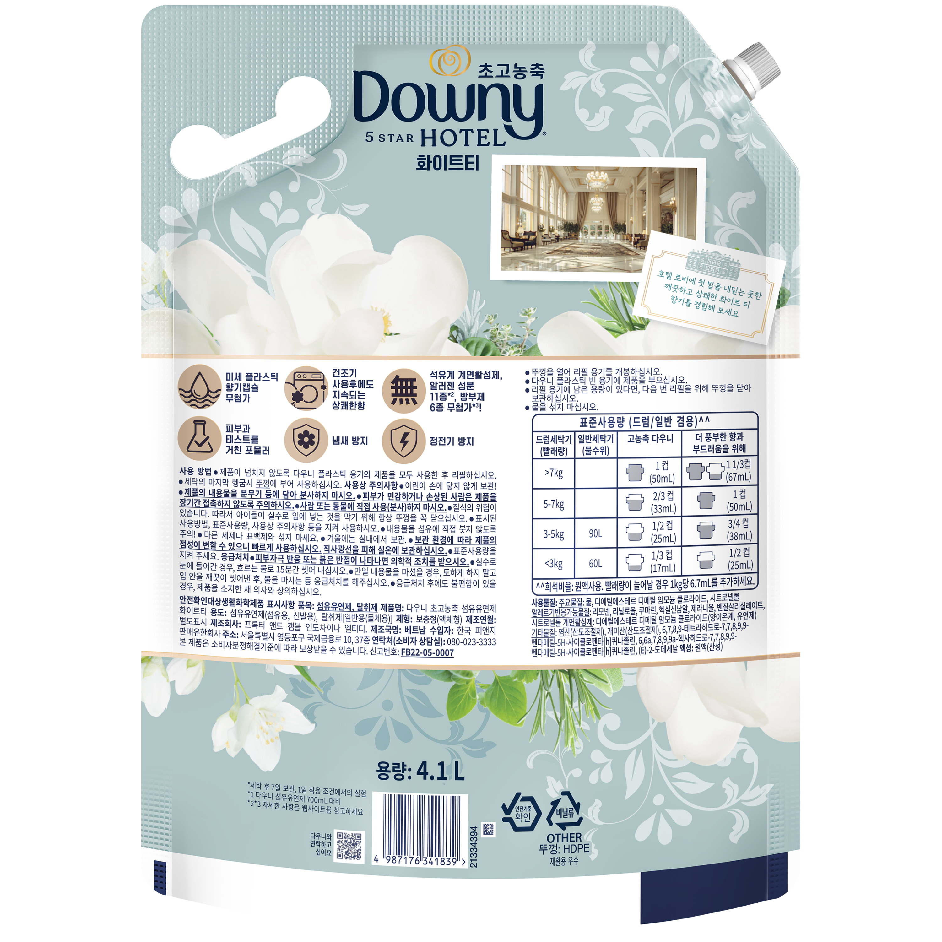 | 품목 및 제품명 | 섬유유연제, 탈취제 / 다우니 초고농축 섬유유연제 화이트티 | 용도(표백제의 경우 계열을 함께표시) 및 제형 | 섬유유연제-섬유용, 신발용, 탈취제-일반용(물체용) / 보충형(액체형) |
