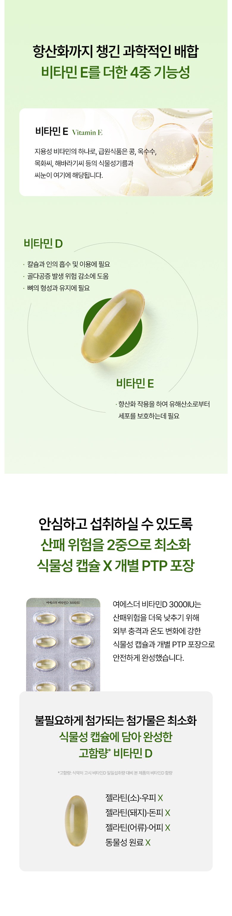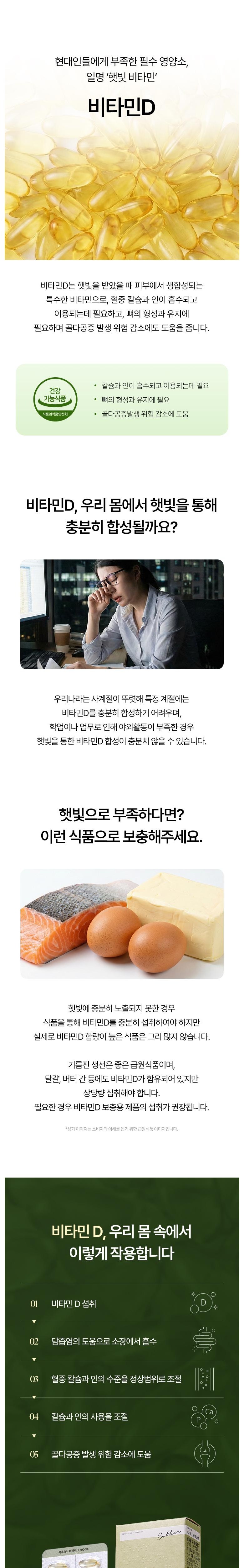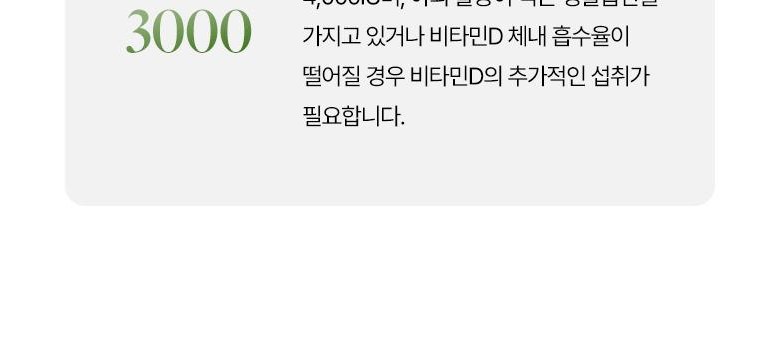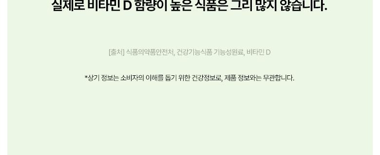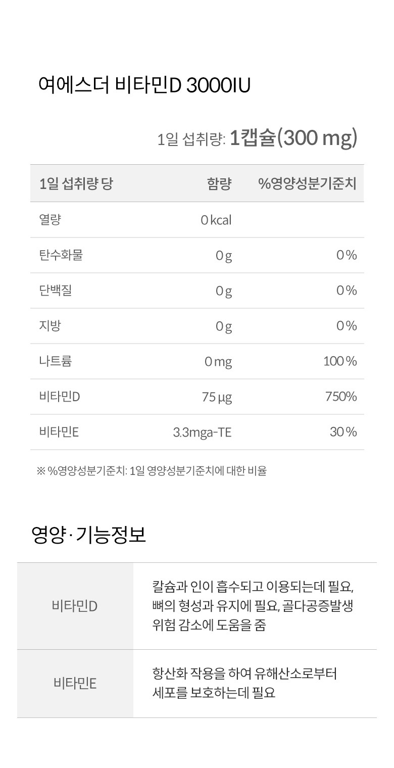 | 원료명 및 함량 | 비타민D3혼합제제유지(비타민D3, 가공유지, 비타민E), d-α-토코페롤, 포도씨유[캡슐기제] 정제수, 변성전분, 글리세린, 카라기난, D-소비톨액-알레르기주의 물질: 대두 함유 | 영양정보 | 상품 상세페이지 참조 |