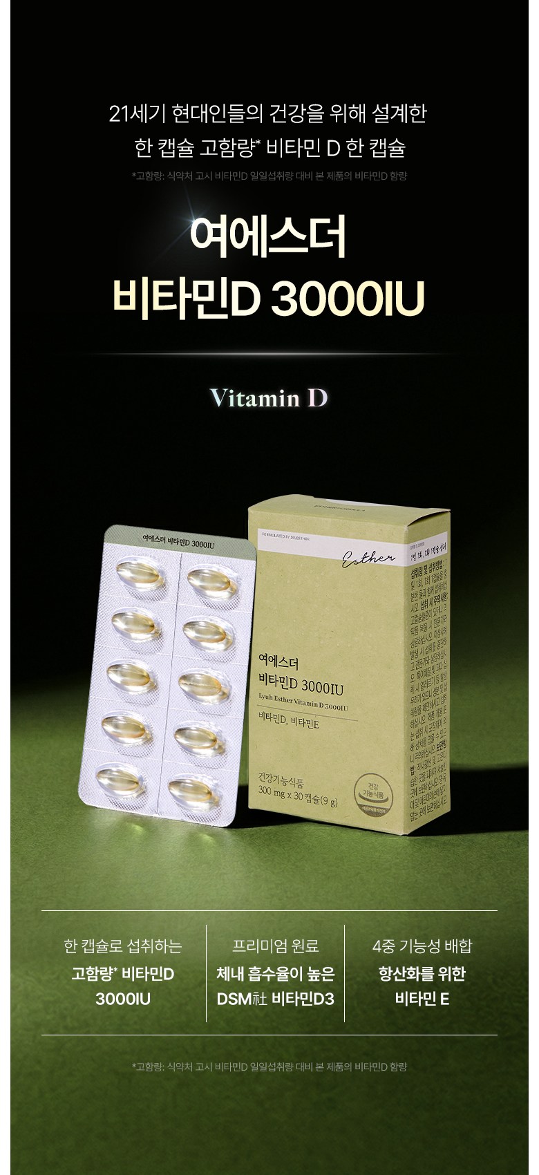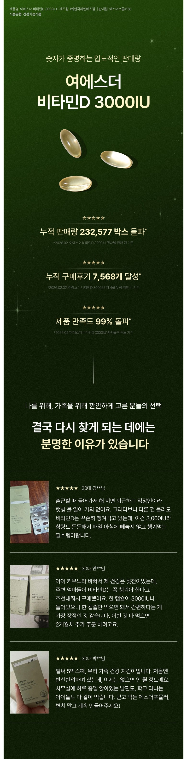 | 제품명 | 여에스더 비타민D 3000IU(건강기능식품에 관한 법률에 따른 심의 필함 /260210614) | 제조업소의 명칭과 소재지 | ㈜한국씨엔에스팜/충청북도 음성군 원남면 상경로 16 |
