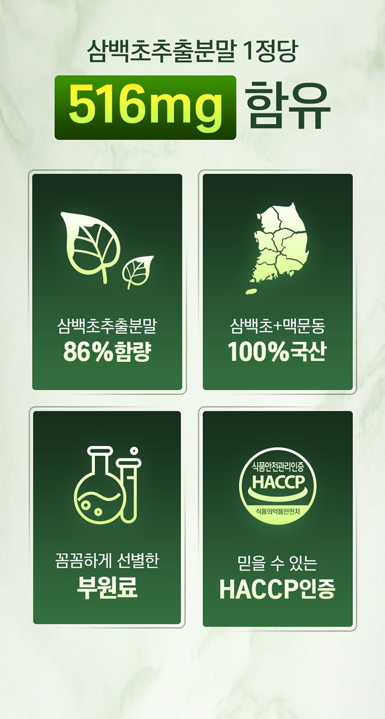 | 원료명 및 함량 | 삼백초추출분말[삼백초추출액(삼백초/국산),덱스트린],맥문동추출분말[맥문동추출액(맥문동/국산),덱스트린],녹차추출분말(국산),모링가추출분말,퀘르세틴추출분말,효소식품 브로멜라인,비타민C,대나무수액추출분말,스테아린산마그네슘 대두 함유 | 영양정보 | 삼백초추출분말[삼백초추출액(삼백초/국산),덱스트린],맥문동추출분말[맥문동추출액(맥문동/국산),덱스트린],녹차추출분말(국산),모링가추출분말,퀘르세틴추출분말,효소식품 브로멜라인,비타민C,대나무수액추출분말,스테아린산마그네슘 대두 함유 |