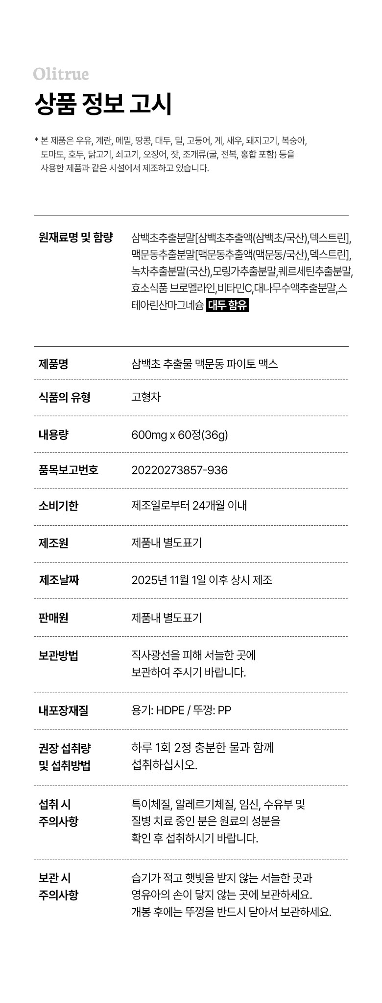 | 소비기한 및 보관방법 | 소비기한(또는 유통기한) : 2027년 11월 25일 이거나 그 이후인 상품 제조년월일 : 2025년 11월 26일 이후인 제조상품 보관방법: 컨텐츠 참조 | 포장단위별 내용물의 용량(중량), 수량 | 1개 60정 (1개월분) |