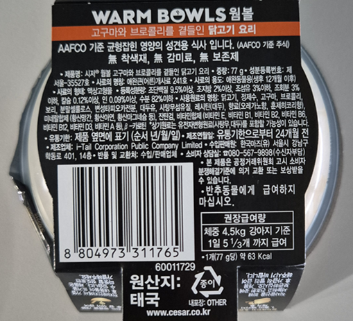 | 품명 및 모델명 | 시저 웜볼 고구마와 브로콜리를 곁들인 닭고기 요리 | 인증/허가 사항 | 사료관리법에 따른 성분등록번호 : 컨텐츠 참조 |