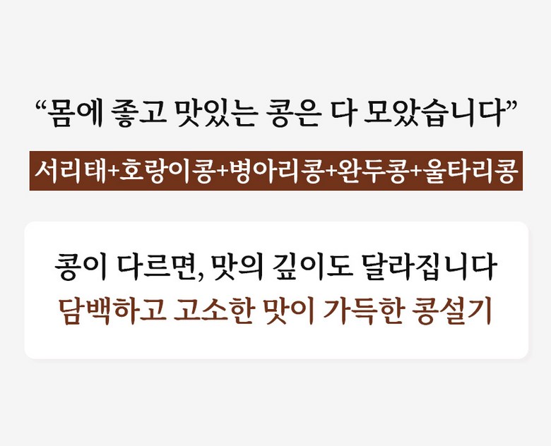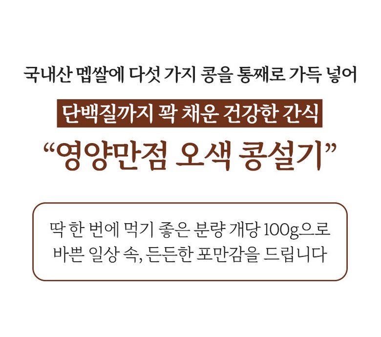 | 포장단위별 내용물의 용량(중량), 수량 | 1kg (100g × 10개) / 2kg (100g × 20개) | 원재료명 및 함량 | 멥쌀(국내산) 50%, 서리태 9%(중국산), 완두콩 9%(캐나다), 병아리콩 9%(미국산), 호랑이콩 9%(중국산), 울타리콩 9%(중국산), 천일염, 설탕, 정제수 |