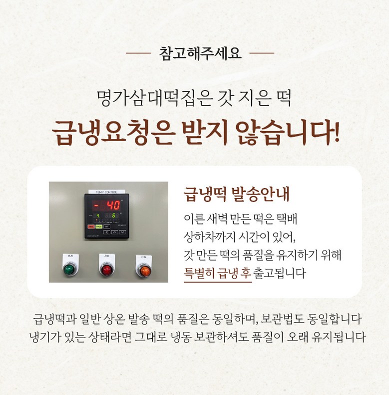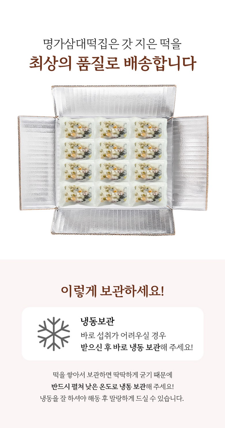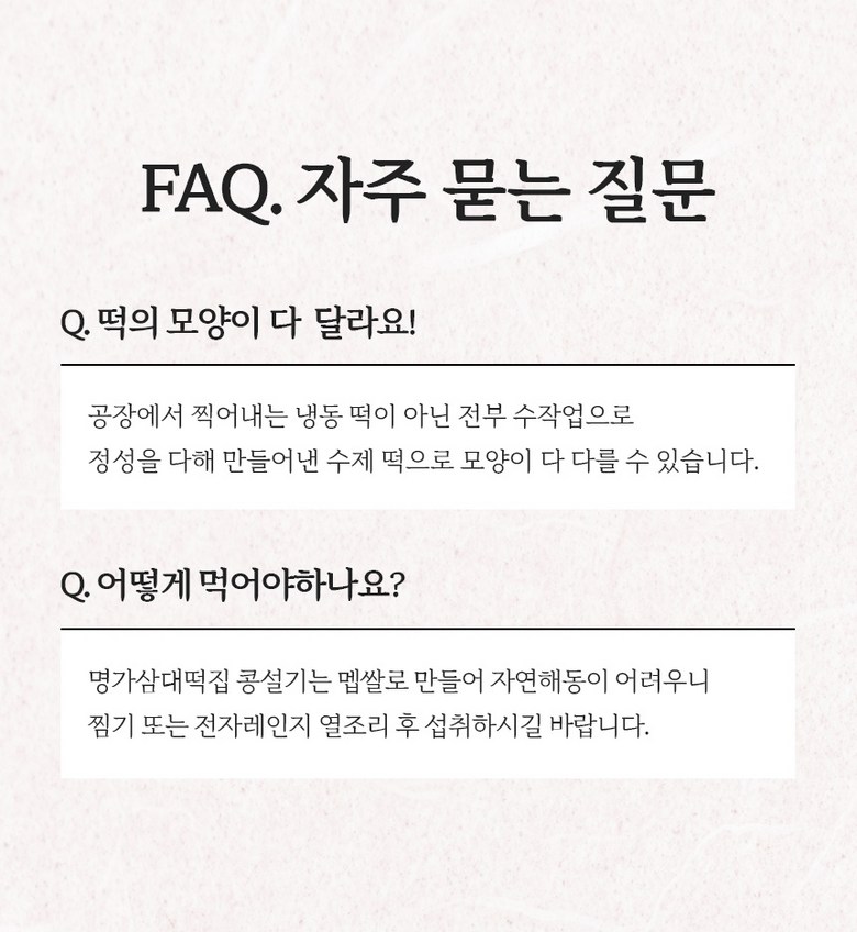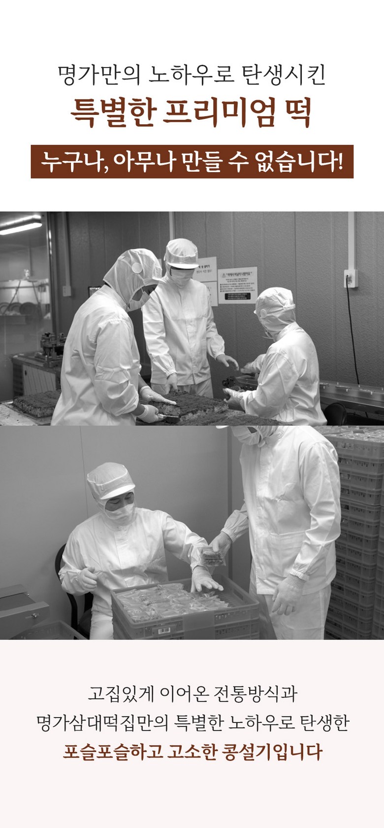 | 생산자 및 소재지 | 명가삼대떡집 협력사 | 제조연월일, 소비기한 또는 품질유지기한 | 수입식품의 경우, 라벨의 소비기한(유통기한) 등 날짜 읽는 법(일/월/년, 월/일/년 등)이 제대로 기재되었는지 다시 한번 확인하신 후 입력하시기 바랍니다. |