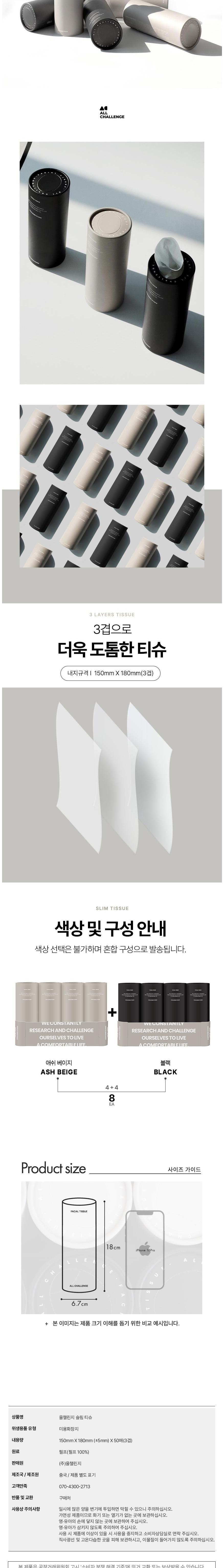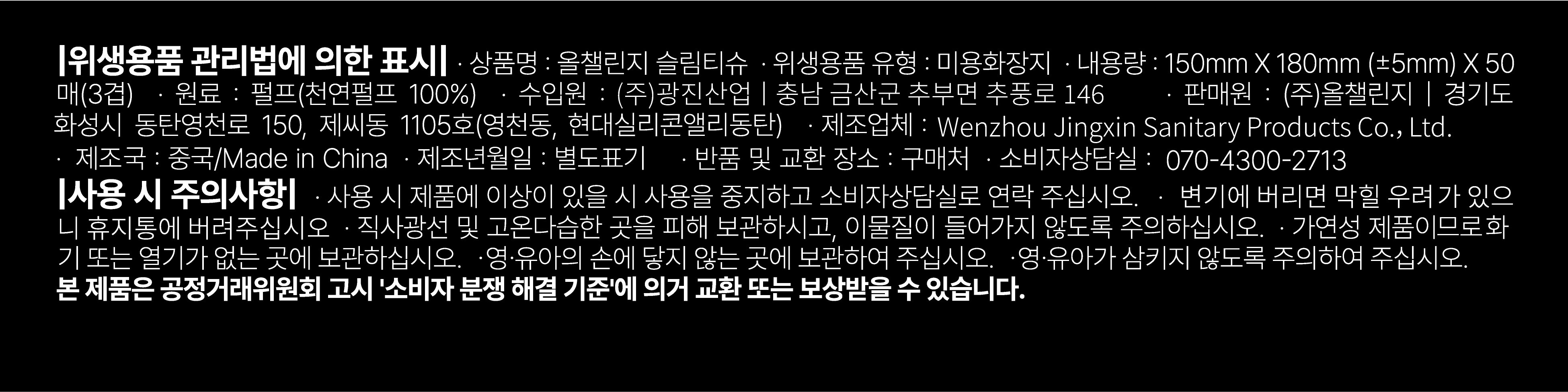 | 품명 및 모델명 | 올챌린지 슬림티슈 | 인증/허가 사항 | 위생용품 |