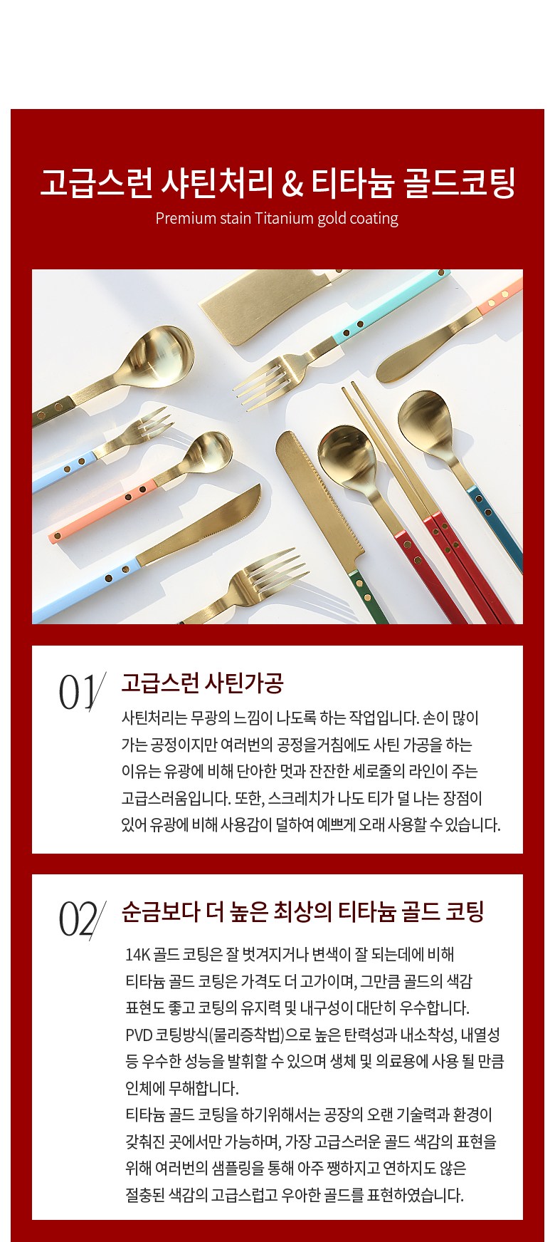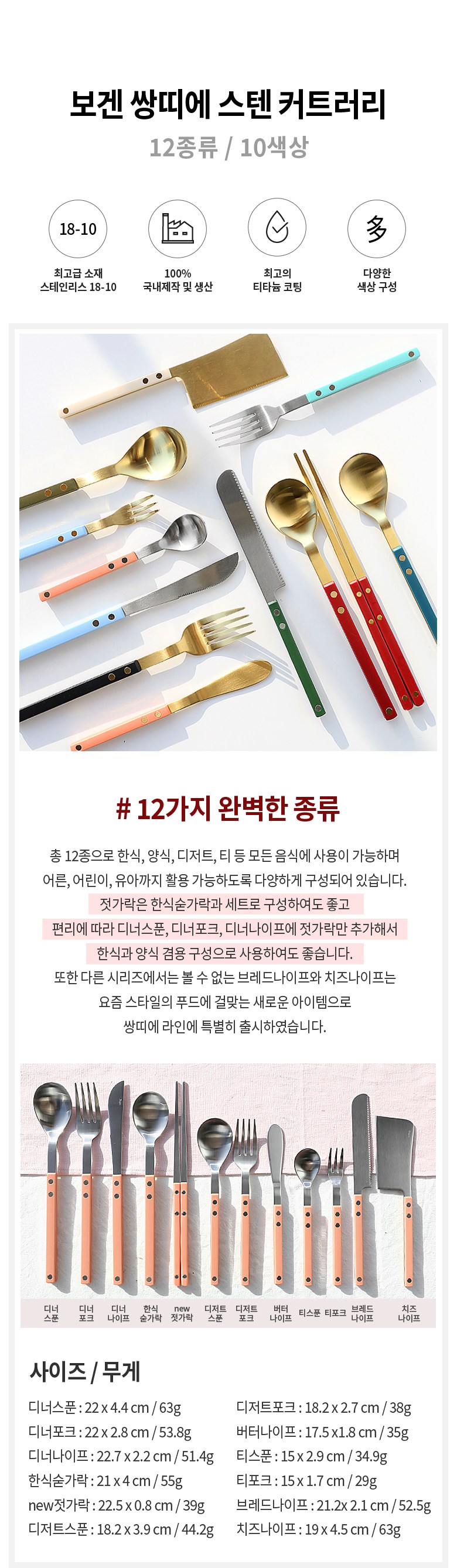 | 품명 및 모델명 | 보겐 쌍띠에 커트러리 스텐 양식기 티타늄골드 한식 수저세트 | 재질 | 스테인레스18-10,폴리카보네이트(PC)/나이프류:SUS420J2 |
