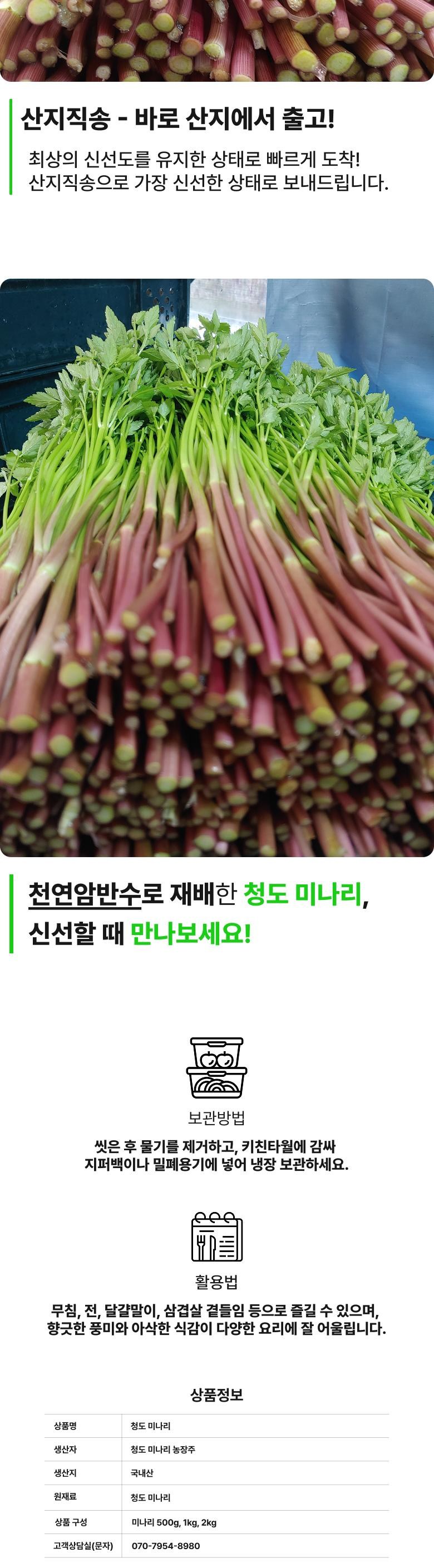 | 품목 또는 명칭 | 청도미나리 | 포장단위별 내용물의 용량(중량),수량,크기 | 500g, 1kg, 2kg |