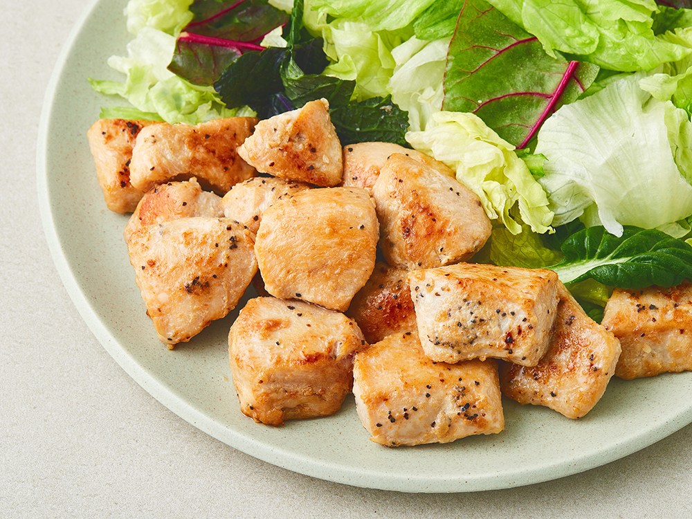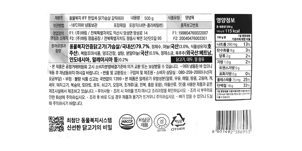 하림의 동물복지 한입쏙 닭가슴살은 스트레스 없이 넓은 공간에서 자란 동물복지 닭고기를 사용했어요. 덕분에 고소한 맛과 쫄깃한 식감이 일품이죠. 또, 개별 급속 냉동 방식으로 육즙 손실을 막아 촉촉함을 그대로 유지했답니다. 한 조각씩 먹기 좋게 손질해 마늘과 흑후추로 양념했으니, 간단히 조리해 샐러드 혹은 덮밥 토핑으로 활용해보세요.