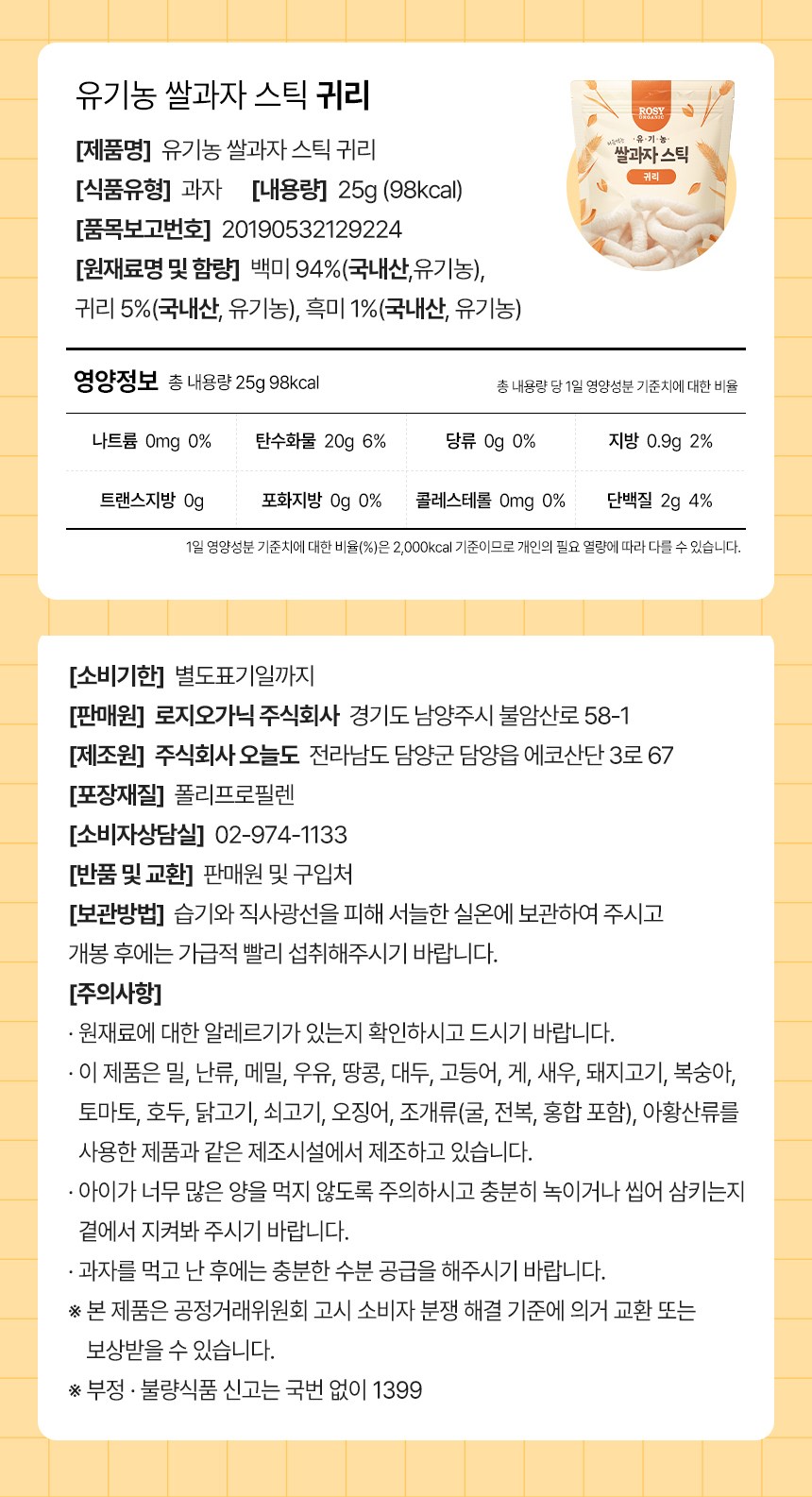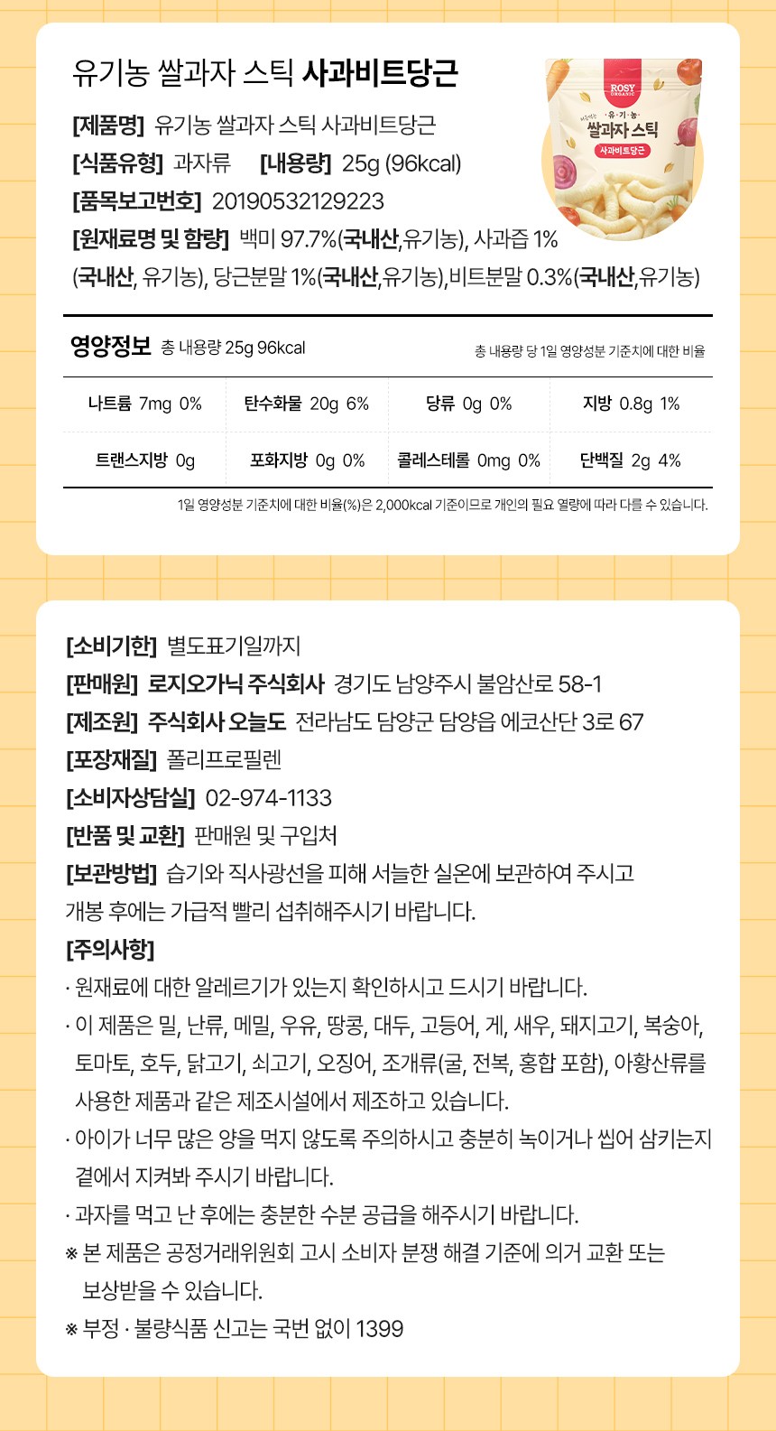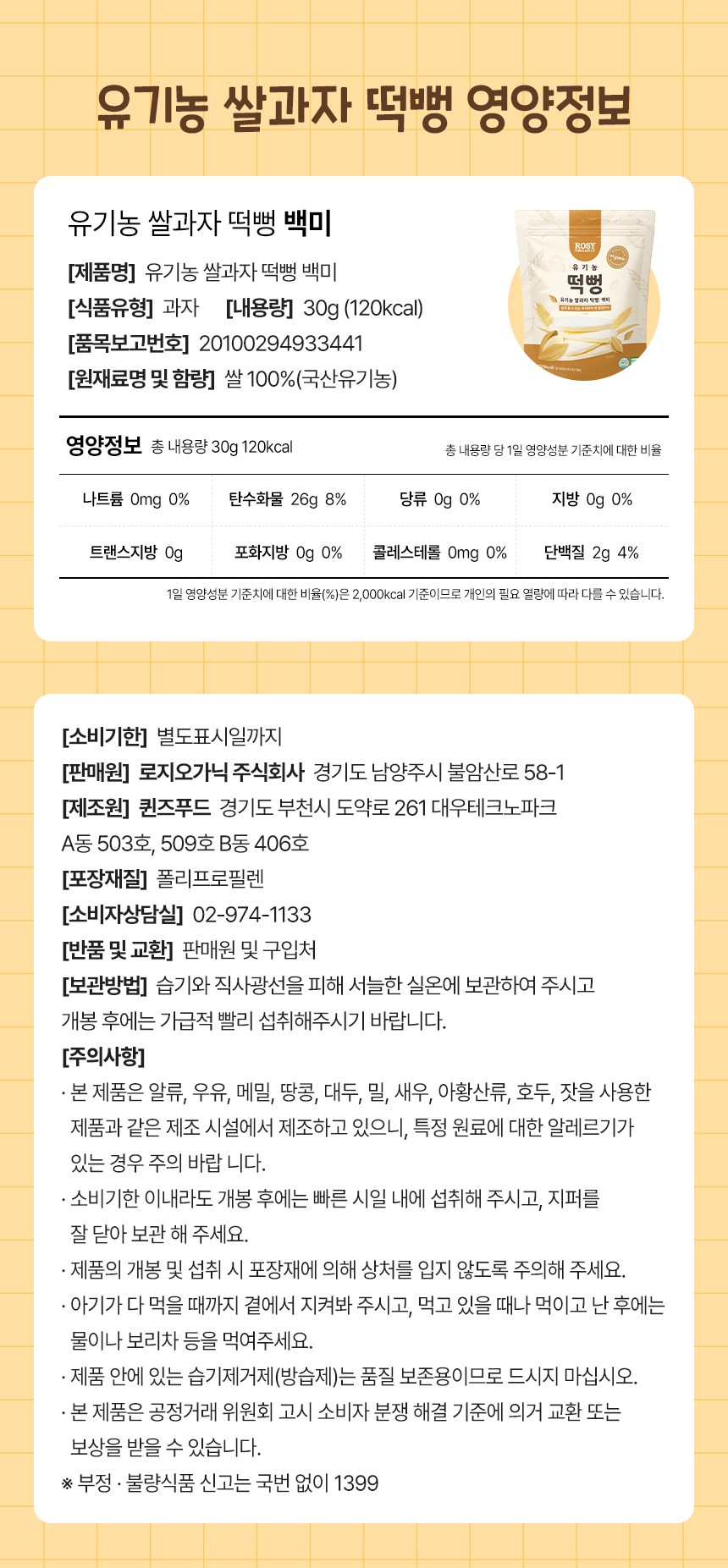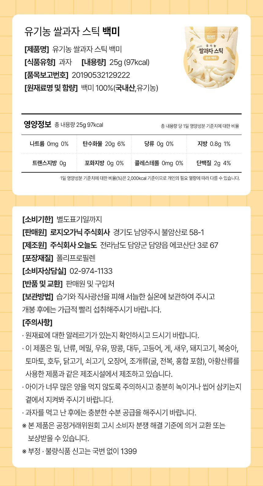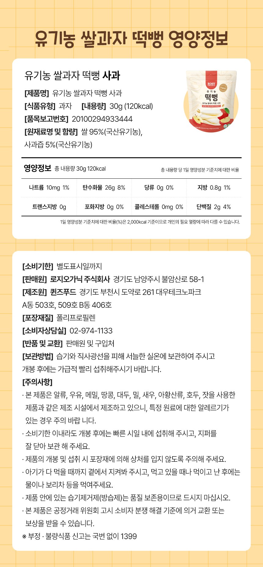 | 제품명 | 로지오가닉 유기농 쌀과자 떡뻥 단호박 + 로지오가닉 유기농 쌀과자 떡뻥 백미 + 로지오가닉 유기농 쌀과자 떡뻥 사과 + 유기농 쌀과자 스틱 사과비트당근 + 유기농 쌀과자 스틱 귀리 + 유기농 쌀과자 스틱 순수 백미 | 식품의 유형 | 컨텐츠 참조 |
