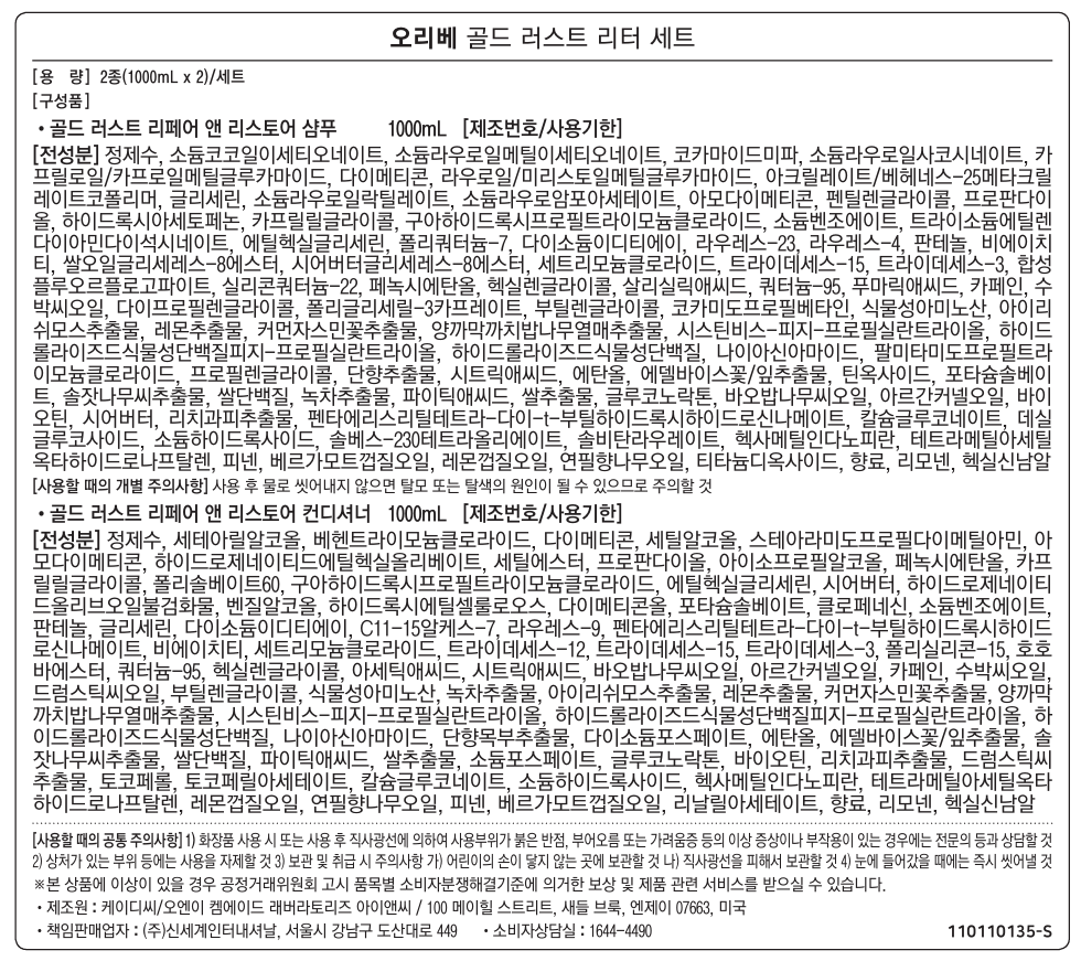 | 사용기한 또는 개봉 후 사용기간 | 본 상품은 해당 물류센터 직발송 상품인 관계로 제조연월일 및 사용기한 정보가 매번 변경되므로 상단 사용기한 정보를 참고해 주세요. | 사용방법 | [골드 러스트 리페어 앤 리스토어 샴푸] 충분히 거품을 낸 후 헹궈 냅니다. [골드 러스트 리페어 앤 리스토어 컨디셔너] 모발에 마사지하고 최소 1분 경과 후 헹궈 냅니다. |