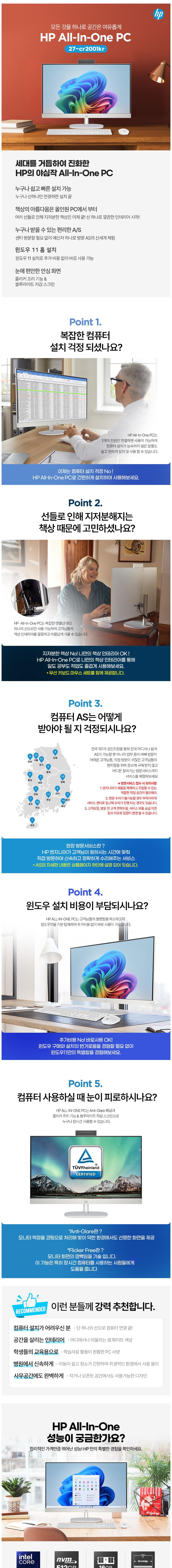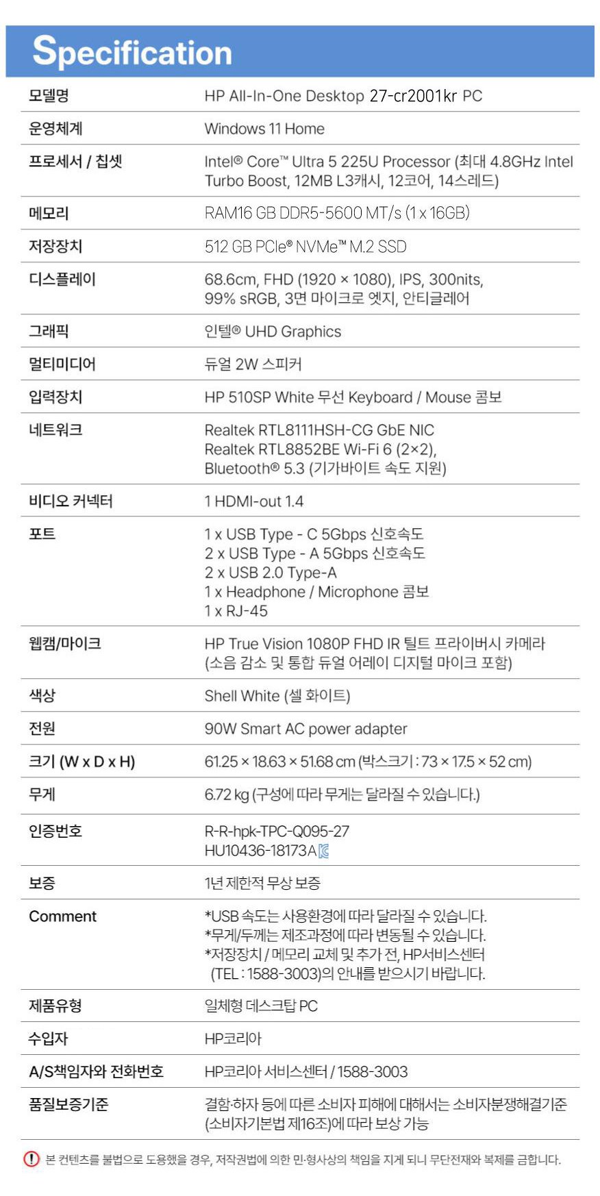 | 품명 및 모델명 | 올인원 PC / HP All-In-One Desktop 27-cr2001kr PC(HP 27 inch All-in-One Desktop AI PC) | KC 인증정보 | 본품: R-R-hpk-TPC-Q095-27 / 키보드,마우스: R-R-hpi-TPA-P005M/ 리시버(키보드,마우스): R-R-hpk-HSA-P011D / 건전지: B052R1106-20001 / 어댑터: HU10436-18173A, R-R-CIY-TPN-CA18 |