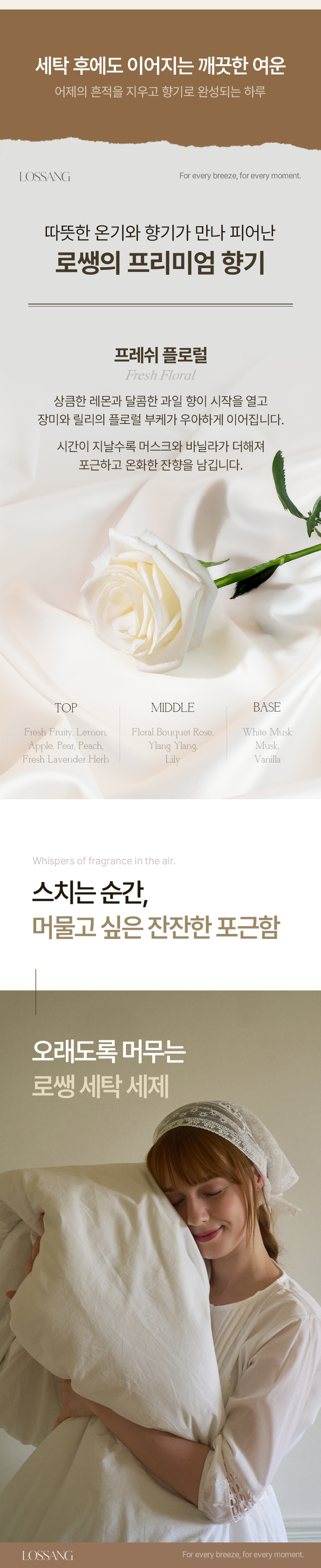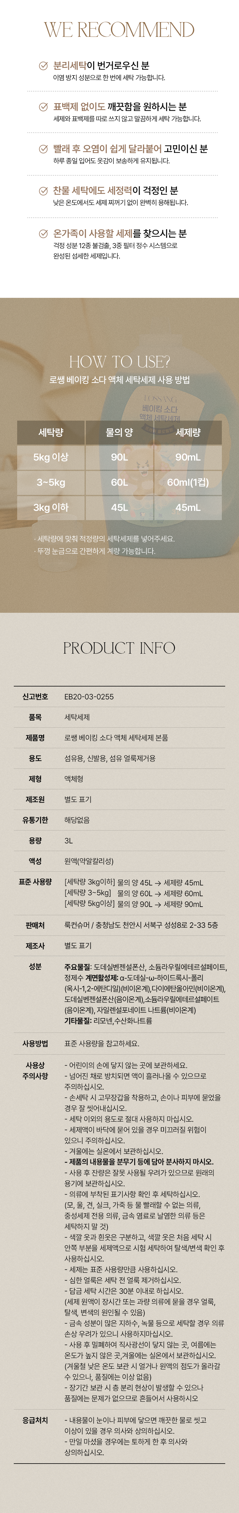 | 품목 및 제품명 | 세탁세제 / 로쌩 실내건조 일반용 드럼용 프레쉬 플로럴향 액상세제 본품 3L, 2개 | 용도(표백제의 경우 계열을 함께표시) 및 제형 | 섬유용, 신발용, 섬유 얼룩제거용/ 액체형 |